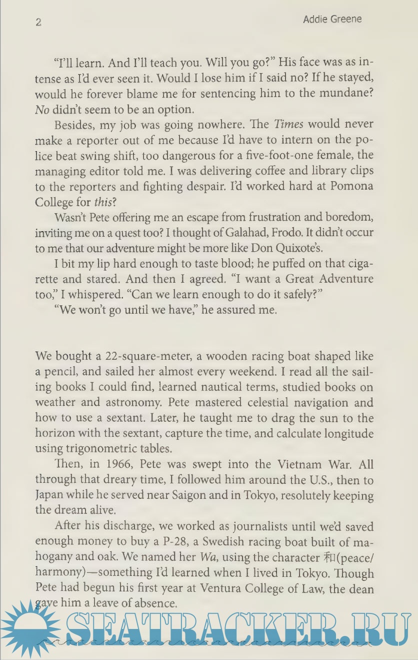 After growing up close to the land on a California ranch, Addie Greene met a man who taught her the glories of the sea. In 1971, the pair decided to sail around the world in a 28-foot boat. She went on to raise two children and pursue a writing career. She lives in Ashland, Oregon, and though 150 miles inland, she can still hear the winds laugh.