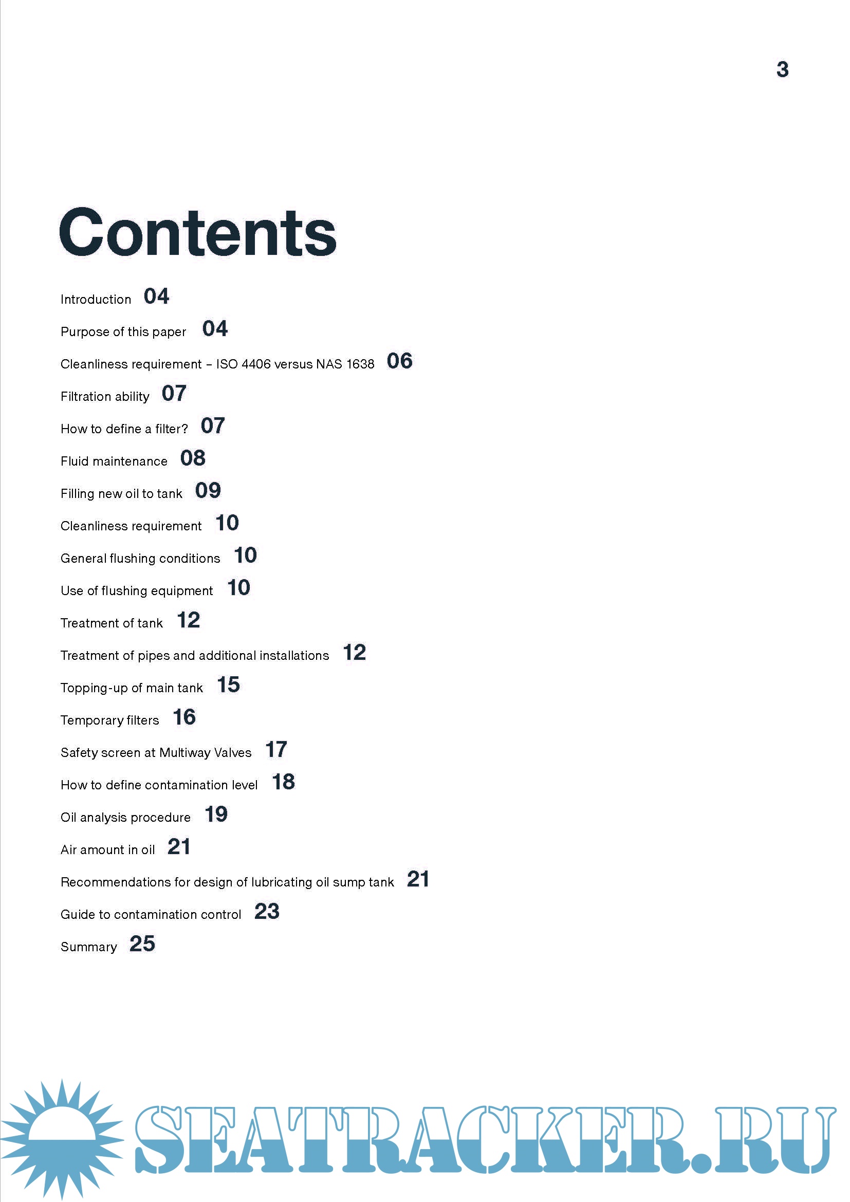 Year: 2023 Language: english Author: MAN Energy Solutions Genre: Handbook Edition: May, 2023 Format: PDF Quality: eBook Pages count: 26 Description: The exacting tolerances in today’s hydraulic systems require tight control of the system contamination. Experience has shown that impurities found in the system originate from the installation and from new oil. If not removed, particles will cause damage to valves, pumps and bearings and, eventually, lead to malfunction of the system and increased wear on the hydraulic components. To avoid the above and reduce flushing time to a minimum, the whole system must be absolutely clean before filling up with oil and starting up the engine. It is vital that hydraulic system installations are carried out in accordance with the best practices, as described in this paper. This will prevent difficulties during start-up of the equipment and reduce the risk of suffering damage to the system. By following the guidelines given in this paper, a quicker and more efficient flushing process is achieved. Update for: