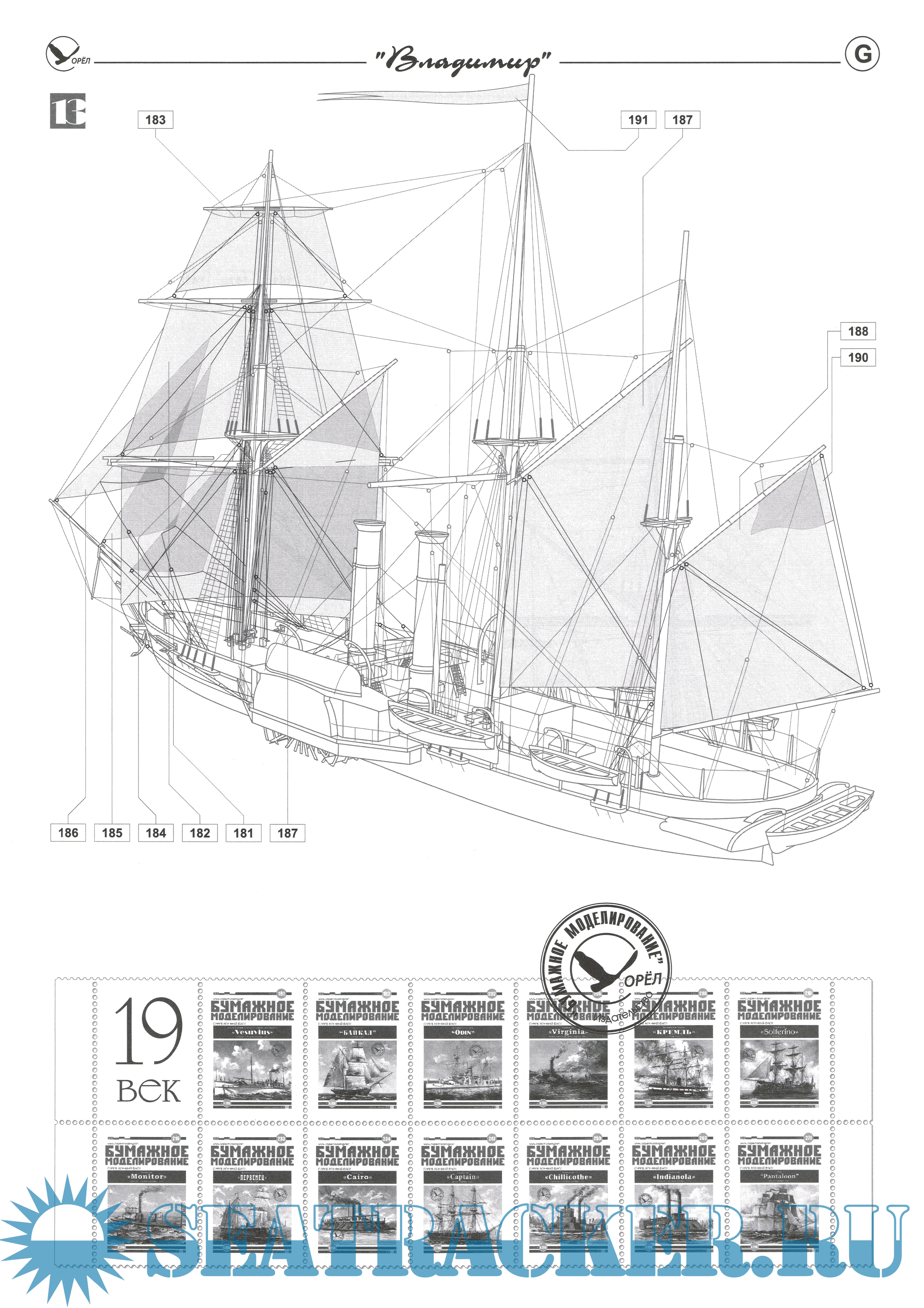 Описание: 28 листов цветных выкроек и описаний для создания бумажной модели пароходофрегата "Владимир" 1850 год в масштабе 1:200