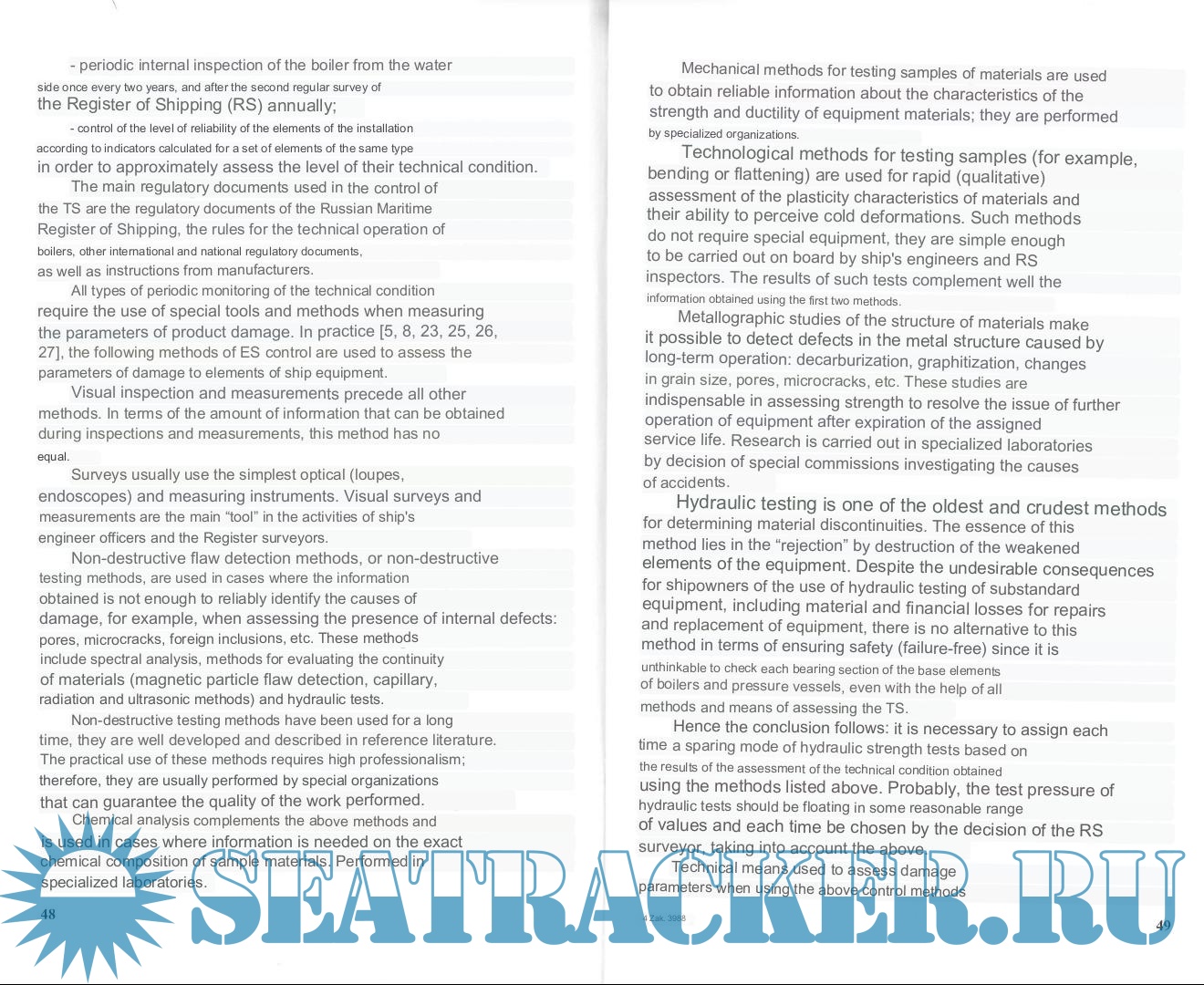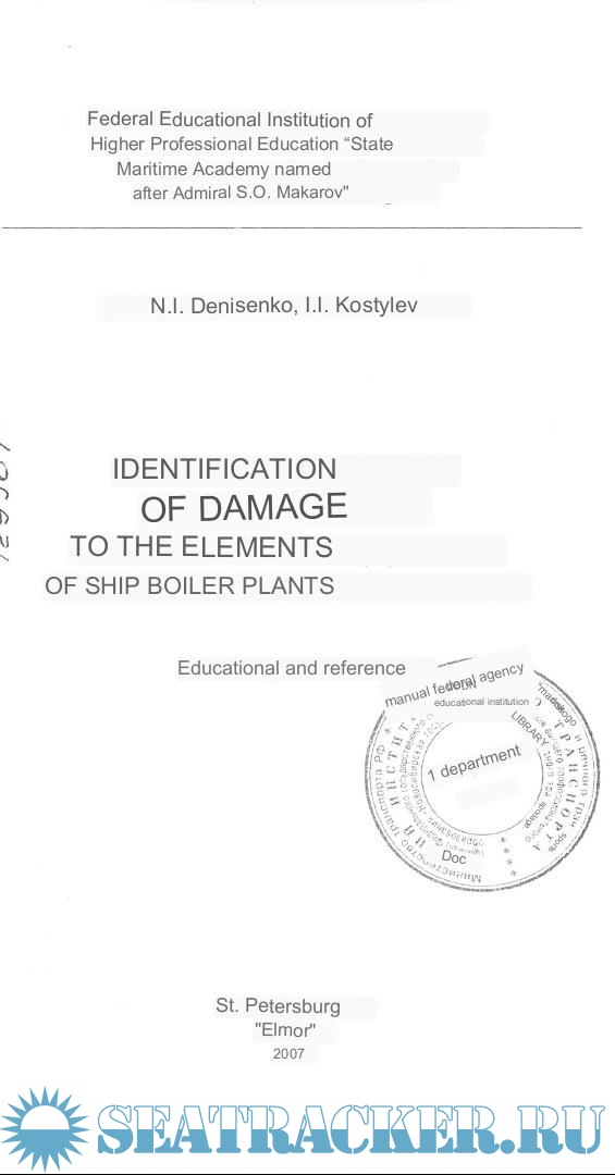 Year: 2007 Language: english Author: N. I, Denisenko, I. I. Kostylev Genre: Textbook Publisher: Elmor Publishing House ISBN: 5-7399-0134-0 Format: PDF Quality: Scanned pages Pages count: 77 Description: The book considers the essence of damage to the elements of ship boiler plants, the main types of damages, the causes of their occurance. A new classification of damage to elements of boiler plants, methods for identifying damage, as well as a technique for assessing the technical condition of the equipment are presented. Equipped with rich illustrative material, the book will be useful to ship mechanics and engineering and technical workers involved in the operation and reair of boiler plants. Additional info: Machine-translated from russian to english for the benefit of the english-speaking members of the forum.