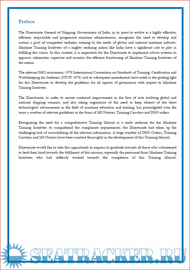 Recognizing the need for a comprehensive Training Manual as a ready reckoner for the Maritime Training Institutes to comprehend the compliance requirements, the Directorate had taken up the challenging task of consolidating all the relevant information. A large number of DGS Orders, Training Circulars and MS Notices have been combed thoroughly in the development of this Training Manual.