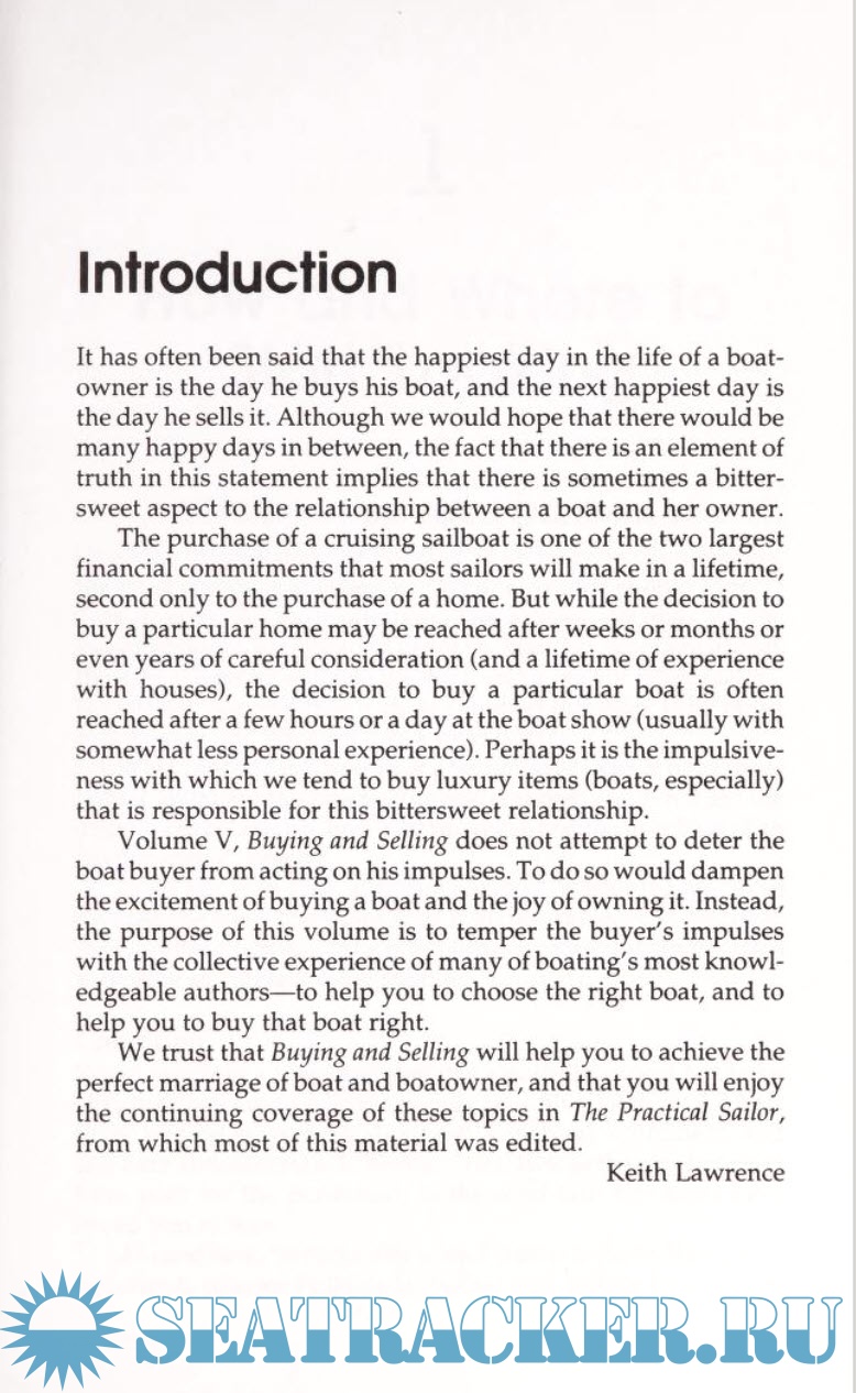 Year: 1995 Language: English Author: Keith Lawrence Genre: Handbook Publisher: Belvoir Books Edition: First ISBN: 978-0961313944 Format: PDF Quality: Scanned pages Pages count: 208 Description: It has often been said that the happiest day in the life of a boat owner is the day he buys his boat, and the next happiest day is the day he sells it. Although we would hope that there would be many happy days in between, the fact that there is an element of truth in this statement implies that there is sometimes a bitter sweet aspect to the relationship between a boat and her owner. The purchase of a cruising sailboat is one of the two largest financial commitments that most sailors will make in a lifetime, second only to the purchase of a home. But while the decision to buy a particular home may be reached after weeks or months or even years of careful consideration (and a lifetime of experience with houses), the decision to buy a particular boat is often reached after a few hours or a day at the boat show (usually with somewhat less personal experience). Perhaps it is the impulsiveness with which we tend to buy luxury items (boats, especially) that is responsible for this bittersweet relationship. Volume V, Buying and Selling does not attempt to deter the boat buyer from acting on his impulses. To do so would dampen the excitement of buying a boat and the joy of owning it. Instead, the purpose of this volume is to temper the buyer's impulses with the collective experience of many of boating's most knowl edgeable authors-to help you to choose the right boat, and to help you to buy that boat right. We trust that Buying and Selling will help you to achieve the perfect marriage of boat and boatowner, and that you will enjoy the continuing coverage of these topics in The Practical Sailor, from which most of this material was edited. Keith Lawrence