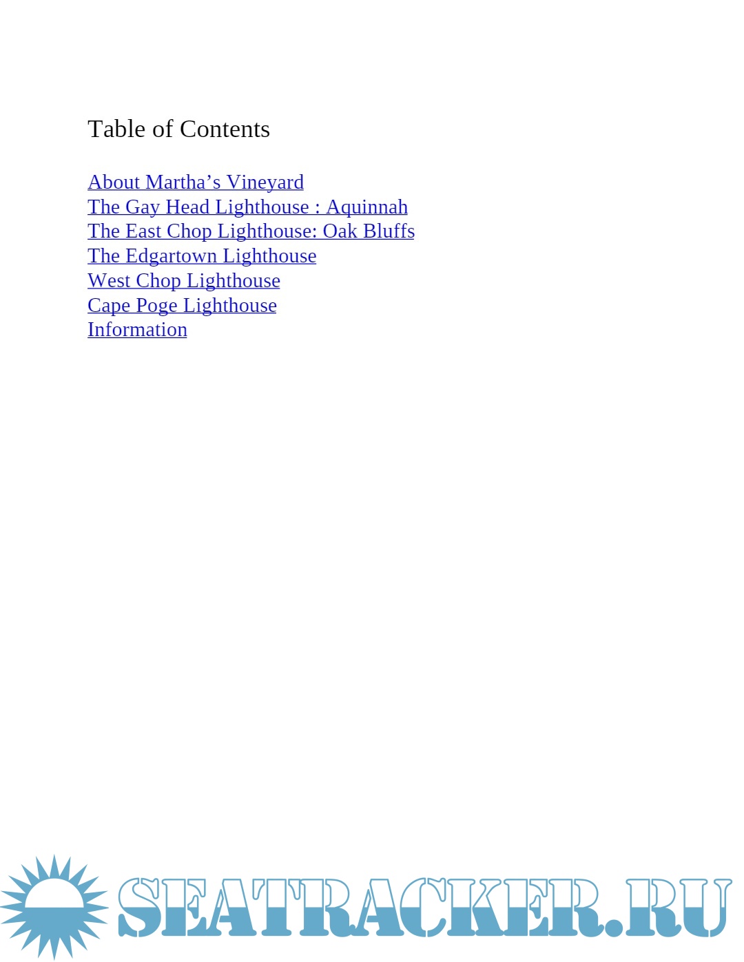Year: 2014 Language: english Author: Crystal Paulson Genre: History Format: PDF Quality: eBook Pages count: 38 Description: Martha’s Vineyard is an island located off the coast of Massachusetts. The only way to get to the island is by plane, ferry, any type of boat or (if you’re really motivated) swim! There are five lighthouses on the Island of Martha's Vineyard. According to lighthouse experts, this is the most varied group of lighthouses in a small, enclosed area in the country. All of the lighthouses are on the north side of the Island; situated on the coast of Vineyard Sound and Nantucket Sound, and at the Edgartown Harbor and Cape Poge. This book is full of colorful photos and interesting facts about each one and marks the location on a simple hand drawn map. Handy for an island visit and delight for lighthouse buffs everywhere.