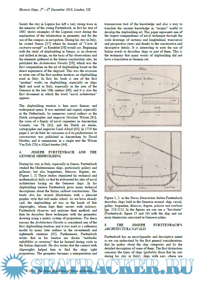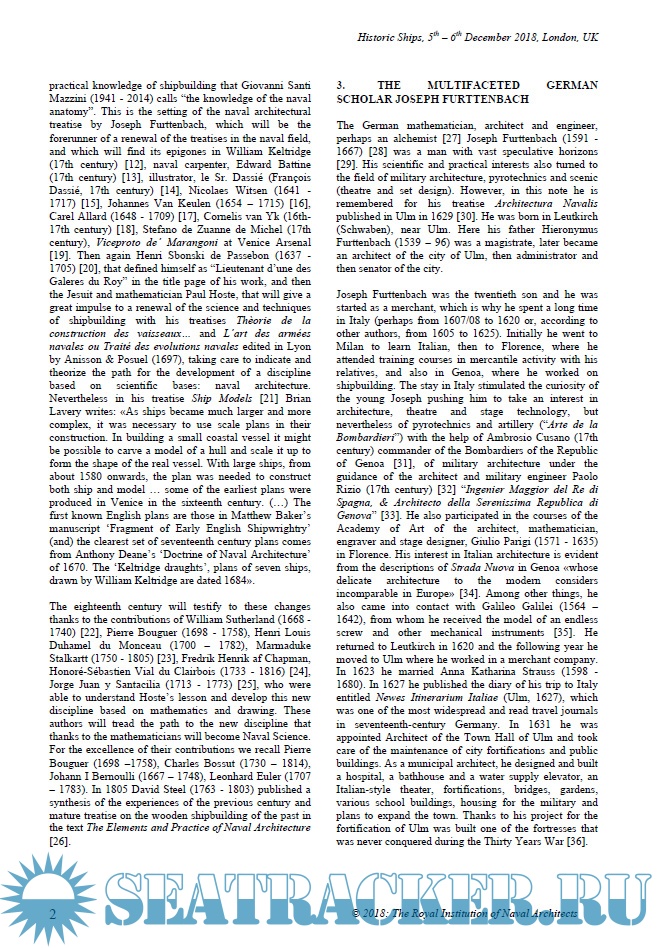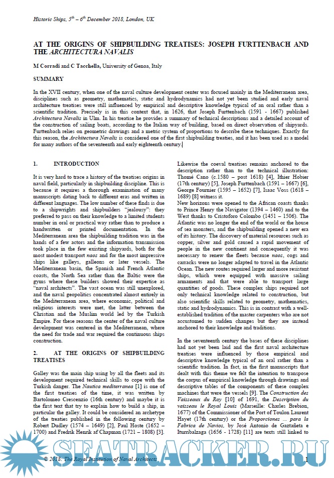 Year: 2018 Language: english Author: M Corradi and C Tacchella Genre: History Format: PDF Quality: eBook Number of pages: 9 Description: In the XVII century, when one of the naval culture development center was focused mainly in the Mediterranean area, disciplines such as geometry, mathematics, static and hydrodynamics had not yet been studied and early naval architecture treatises were still influenced by empirical and descriptive knowledge typical of an oral rather than a scientific tradition. Precisely is in this context that, in 1626, that Joseph Furttenbach (1591 - 1667) published Architectura Navalis in Ulm. In his treatise he provides a summary of technical descriptions and a detailed account of the construction of sailing boats, according to the Italian way of building, based on direct observation of shipyards. Furttenbach relies on geometric drawings and a metric system of proportions to describe these techniques. Exactly for this reason, the Architectura Navalis is considered one of the first shipbuilding treaties, and it has been used as a model for many authors of the seventeenth and early eighteenth century.