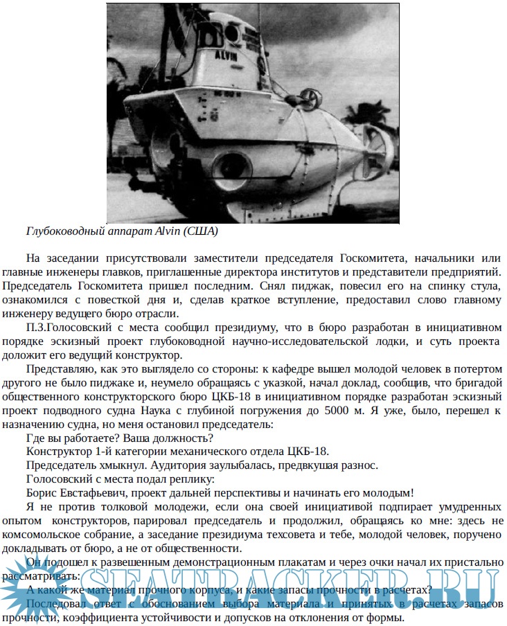 Между тем, сложность задач, стоящих перед участниками работ по «глубоководной тематике» - так это называлось в Министерстве судостроительной промышленности - можно сравнить только с теми, что пришлось решать создателям космических кораблей. Но если фамилии Королева и Гагарина известны всему миру, то о главном конструкторе глубоководной техники Юрии Константиновиче Сапожкове или первом капитане-глубоководнике Михаиле Николаевиче Диомидове читатель впервые узнает из этой книги.