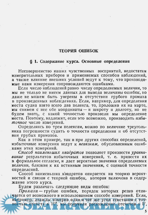 Настоящий курс, написанный в связи с введением в учебный план судоводительских факультетов высших мореходных училищ специального раздела курса высшей математики - теории ошибок и способа наименьших квадратов, - предназначен, в первую очередь, для преподавателей, ведущих этот курс, и для аспирантов кафедр судовождения.