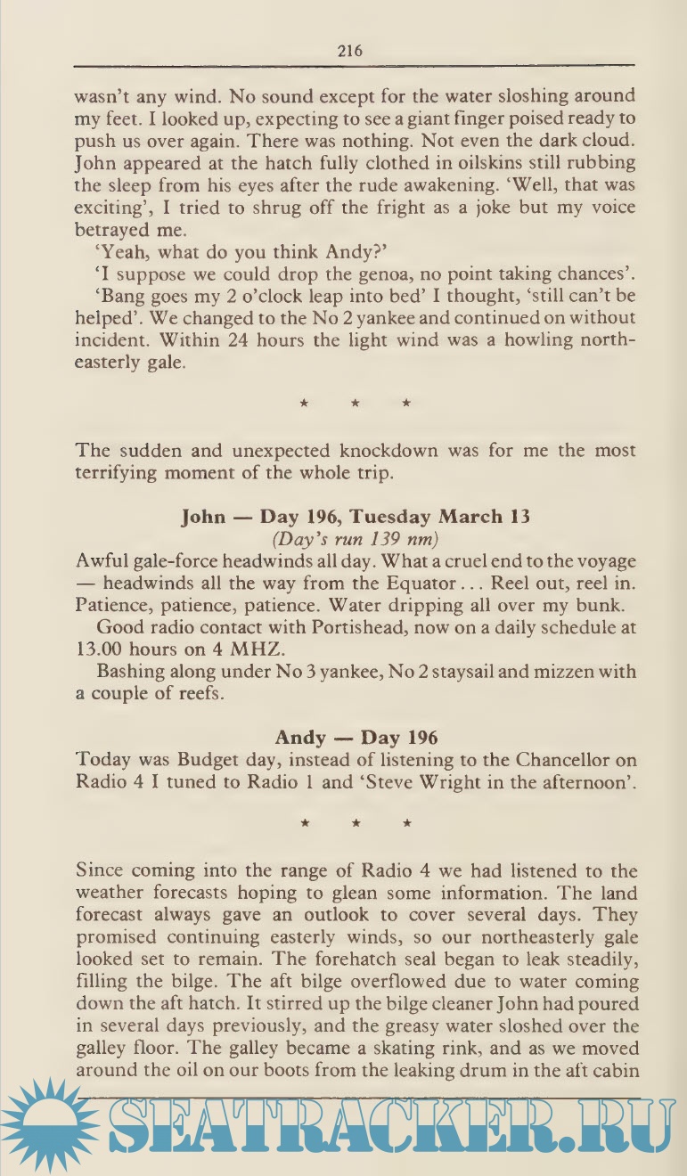 Year: 1985 Language: English Author: John Ridgway Genre: Textbook Publisher: Sterling Pub Co Inc Edition: First ISBN: 978-0850597578 Format: PDF Quality: Scanned pages Pages count: 242 Description: He had sailed singlehanded across the Atlantic, rowed across with a companion and competed in the Whitbread Round-the-World Yacht Race. In the summer of 1983, John Ridgeway sought another challenge. With Briggs, the sailing instructor at his School of Adventure in Scotland, he would circle the globe without touching land; the target, to set a record for fastest passage. They departed from Ardmore, Scotland, on September 1, on the school's 57-foot ketch, English Rose VI. Each man kept a diary; the reader follows the day-by-day progress of the voyage. Briggs's running account of ship maintenance will be of special interest to long-distance sailors; for the older and more experienced Ridgeway, the journey was a period of self-examination. The pair endured physical and mental hardships, extremes of weatherfrustrating calms, violent storms, one near-capsize. In March 1984, English Rose VI and its crew returned to Ardmore after a record 203-day passage. For all sailors, and for landlubbers who enjoy adventure.