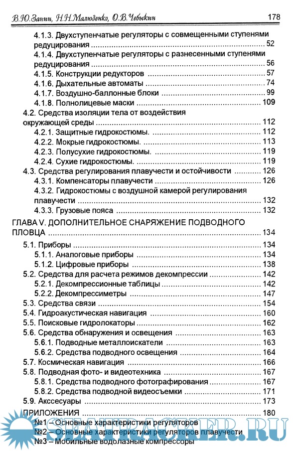 Описание: Рассмотрены все элементы экипировки подводного пловца воздушно-баллонные дыхательные аппараты, гидрокостюмы, маски, ласты, трубки Впервые описаны такие изделия, как компенсаторы плавучести, декомпрессиметры и средства беспроводной телефонной связи водолазов. Являясь первым изданием, отражающим современное состояние мирового рынка водолазной техники, книга представляет интерес как для профессиональных водолазов, так и для начинающих любителей подводного плавания.