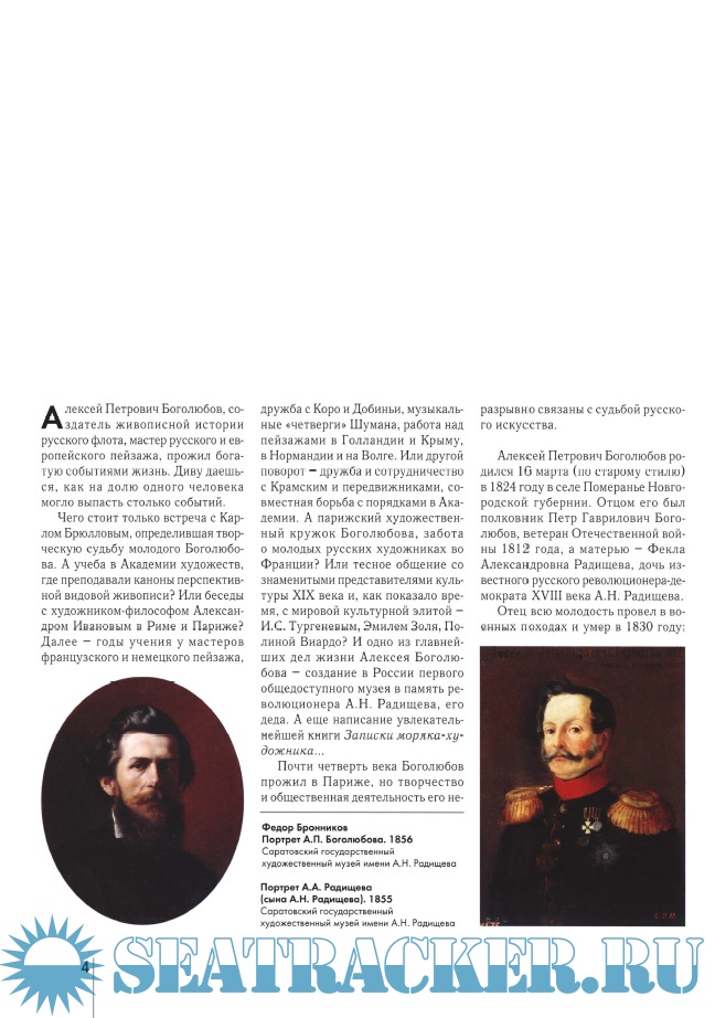 Описание: Создатель живописной истории русского флота, Алексей Петрович Боголюбов жил и творил во второй половине XIX века. Почти четверть века он прожил в Париже, но его творчество и общественная деятельность неразрывно связаны с судьбой русского искусства. Творчество Боголюбова связано с историей русского флота. Он и сам был горд тем, что, изображая корабли, не делал ошибок. С его именем связано открытие первого в России общедоступного музея имени А. Н. Радищева, его родного деда. По завещанию художника деньги и большое творческое наследие достались музею.