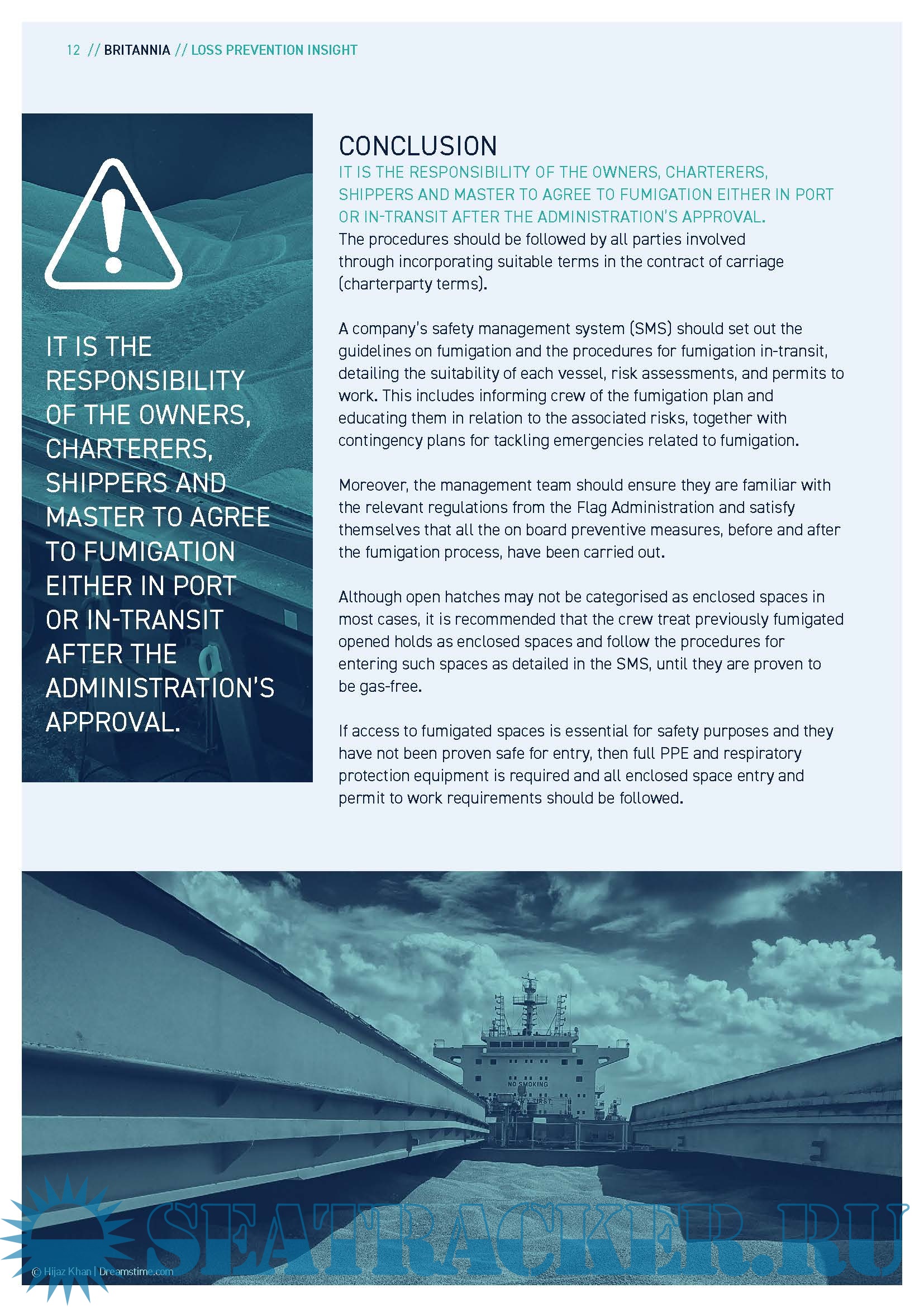In this article highlighted the importance of understanding the risks associated with fumigation on board vessels. The application for in-transit fumigation should be made with the agreement of the Port State Administration, either for the fumigation being intentionally continued in sealed cargo spaces during the voyage without aeration prior to sailing, or for in-port cargo fumigation.