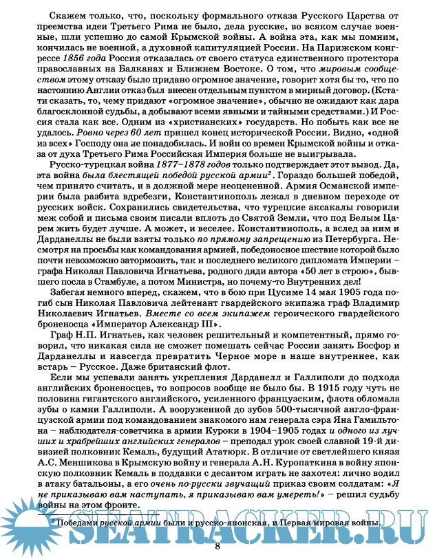 Год выпуска: 2009 Язык: русский Автор: Галенин Борис Жанр: История Издательство: КРАФТ+ Формат: DjVu Качество: Изначально компьютерное (eBook) Количество страниц: 761 Описание: Цусимское сражение — ключевой фактор русской и мировой истории, ее точка ветвления. Для прояснения весьма специфических черт Цусимского боя подробно рассмотрены все значительные боевые действия русского флота в войну 1904-1905 годов.В работе восстановлено действительное развитие событий при Цусиме, в том числе графически воссоздана начальная фаза боя, что можно рассматривать как новое слово в историографии военно-морских сражений и серьезное научное открытие.Результатом проведенного расследования стал вывод, что Цусимский бой, во всяком случае его завязка — первый удар русской эскадры, является несомненной тактической победой русского флота. А Цусима в целом — победой русского воинского духа, не сломленного никакими материальными факторами.Первыми осознали и поняли это японские адмиралы, исказив и извратив в своих донесениях и схемах правду о начале боя. В свете скрываемой до сих пор от мира правды можно понять, почему морской министр победоносной Японии — уже после Цусимы! — отчаянно подталкивал свое правительство «к уступкам во имя заключения мира».В заключение трилогии показано истинное значение русско-японской войны в нашей истории как последней победы Святой Руси.