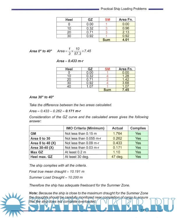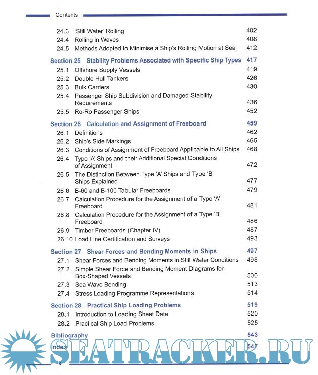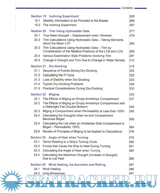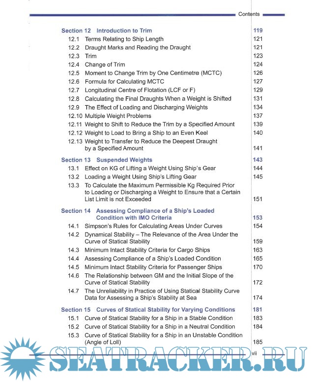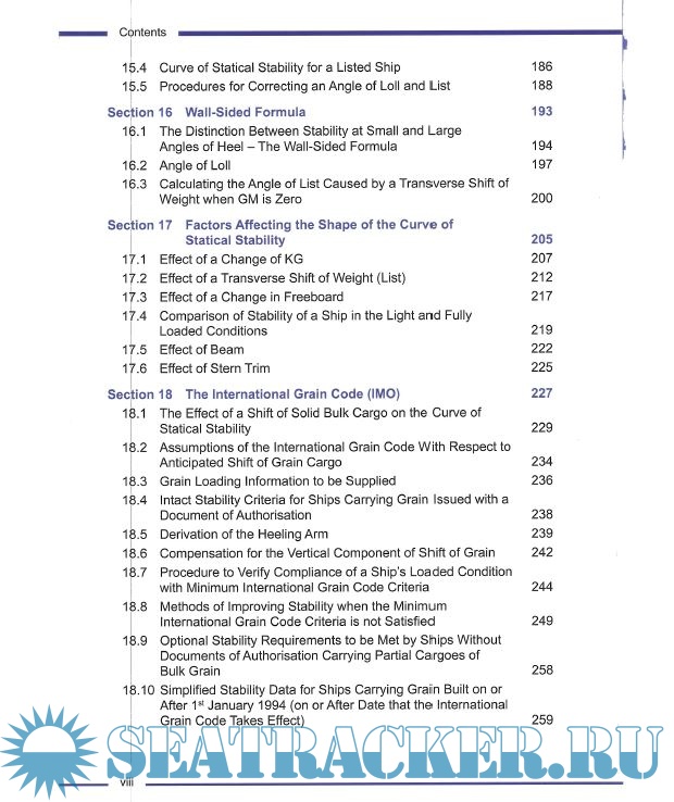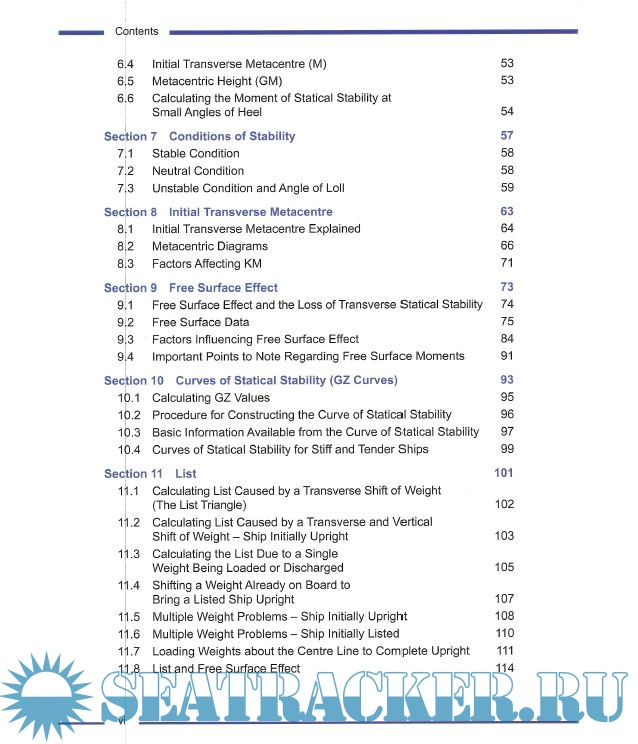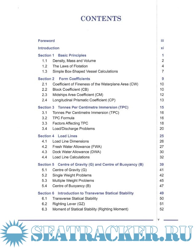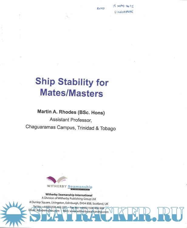 Based on the syllabus for Ship Stability for the STCW 95 Chief Mate/Master this study manual for deck officers includes the following chapters: Basic Principles, Form Coefficients, Tonnes Per Centimetre Immersion, Introduction to Load Lines, Centre of Gravity (G) and Centre of Buoyancy (B), and Introduction to Transverse Statical Stability, Conditions of Stability, Initial Transverse Metacentre, Free Surface Effect, Curves of Statical Stability, List, Introduction to Trim, Suspeneded Weights, Assession Compliance of a Ship’s Loaded Condition with IMO Criteria, Curves of Statical Stability, The Wall Sided Formula, Factors Affecting G2 Curve Shape, The International Grain Code, Inclining Experiment, Trim Using Hydrostatic Data, Dry Docking, Bilging, Angle of Heel dur to Turning, Wind Ice and Rolling Effects, Stability Problems Associated with Specific Ship Types, Calculation and Assignment of Freeboard, Shear Forces and Bending Moments in Ships, and Practical Ship Loading Problems.