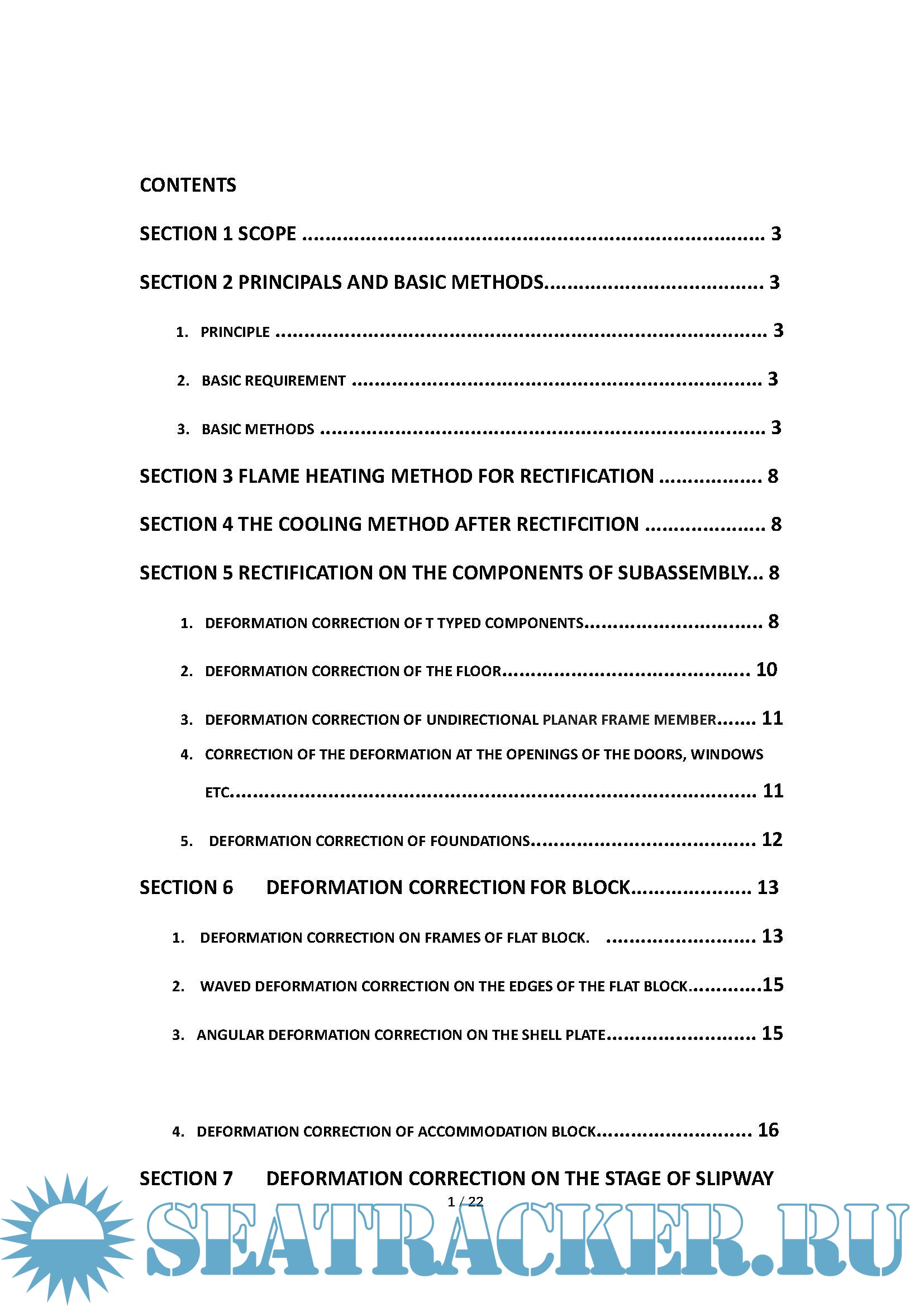 Description: This technique stipulates the principle and basic method of flaming correction of hull, heating/cooling methods for deformation rectification. Deformation correction on the stage of small and medium group members; large and general group; block erection, and the considerations of deformation correction by flame. This process is suitable for the deformation of the ship structure in the process of flame cutting and welding.