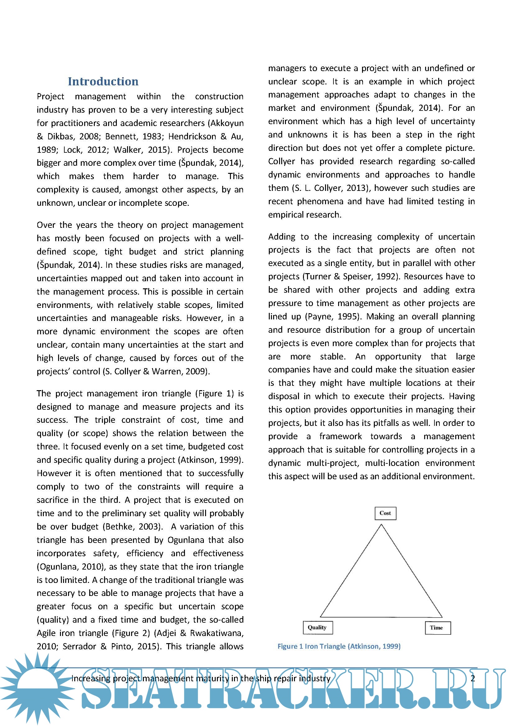 Description: The ship-repair industry is well-known for increases in project duration, costs and scope. Both client and company know that the estimates that have been made at the start of the projects are likely, almost inevitably going to change. Generally these changes are accepted and resolved along the way. However, this situation might change when the economic environment changes. Ship owning companies can hire organizations that stand between them and the yard, to prevent the changes within the project from affecting the outcome. The yards in their turn have inefficiency problems caused by the increase in time. To prepare for the changes in the market and improve the general yards’ processes this paper has focused on the problems that occur in large non-standard projects executed in four different ship-repair yards. These results have been compared to existing project management approaches to determine whether these are applicable to the ship repair environment. The result has been a project management maturity approach for the ship repair industry to improve the level of project management in large non-standard projects .