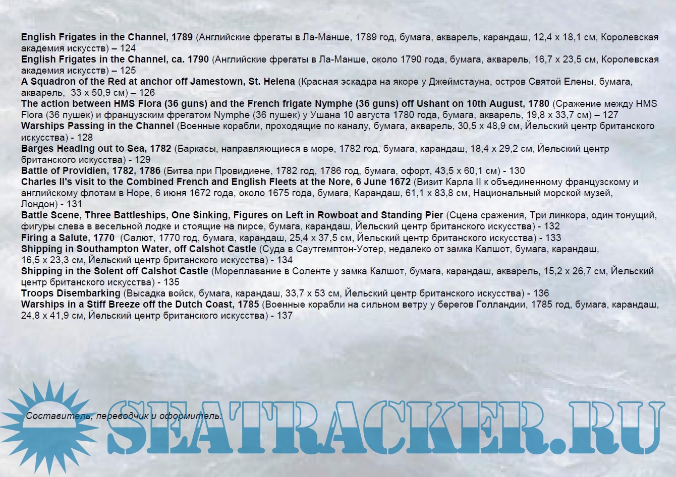 Год выпуска: 2023 Язык: русский Автор: 5sb1 (Cоставитель, переводчик и оформитель) Жанр: Другое Издание: Художники-маринисты Формат: PDF Качество: Изначально компьютерное (eBook) Количество страниц: 144 Описание: В четвёртом выпуске (Художники-маринисты) представлено 129 репродукций английского живописца французского происхождения Dominic Serres. Его работы представлены в музее Военно-морской академии США в Аннаполисе; Художественной галерее Новой Шотландии в Галифаксе; галерее Тейт в Лондоне; музее Фицуильяма в Кембридже; Национальном морском музее в Гринвиче, Национальной галерее в Дублине в других музеях, а также в частных коллекциях.