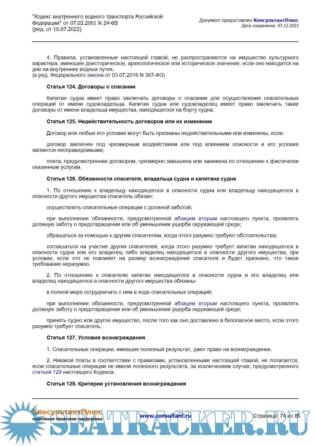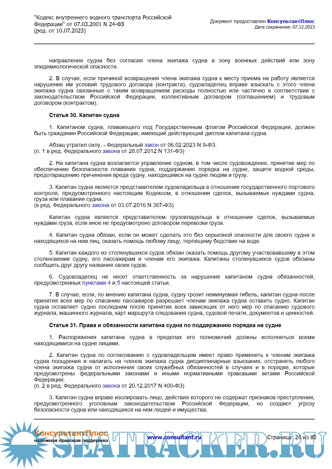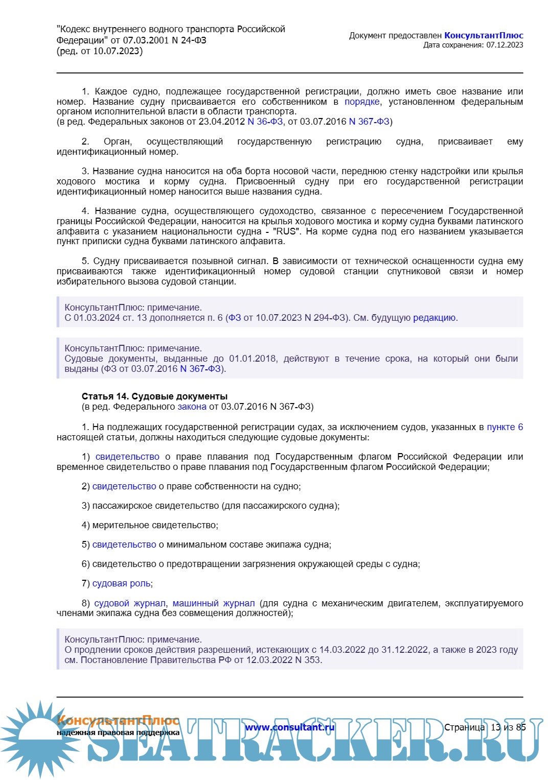 Описание: "Кодекс внутреннего водного транспорта Российской Федерации" от 07.03.2001 N 24-ФЗ(ред. от 10.07.2023).