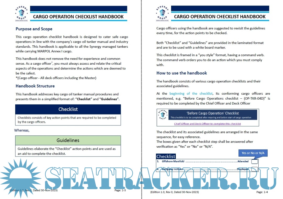 Year: 2023 Language: english Author: Synergy Marine Pte. Ltd. Genre: Handbook Edition: Edition 1.0, Rev 0, Dated 30-Nov-2023 Format: PDF Quality: eBook Pages count: 20 Description: This cargo operation checklist handbook is designed to cater safe cargo operations in line with tne company's cargo oil tanker manual alild industry stalildards. This handbook is applicable to all the Synergy managed tanlkers while carrying MARPOIL Annex I cargo. Tnis handbook does not remove the need for experience and common sense. As a cargo officer you must always assess alild relate tliie critical aspects of the operations and determine the actions whfch are deemed to be the safest.