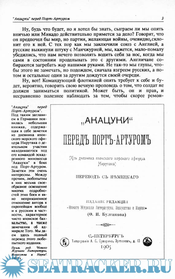 Описание: Эта книга содержит в себе заметки из дневника японского морского офицера Нирутака о деятельном участии находившегося под его командой эскадренного миноносца "Акацуки" в боях под Порт-Артуром.