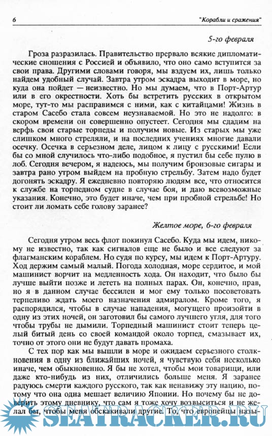 Год выпуска: 1995 Язык: русский Автор: В.В.Арбузов Жанр: История Издание: Серия: Корабли и сражения Формат: PDF Качество: Отсканированные страницы Количество страниц: 60 Описание: Эта книга содержит в себе заметки из дневника японского морского офицера Нирутака о деятельном участии находившегося под его командой эскадренного миноносца "Акацуки" в боях под Порт-Артуром. Заметки эти очень интересны. Между прочим, любопытны в них весьма своеобразное освещение многих подробностей этих боев и явно неприязненное отношение автора к европейцам вообще и к русским в частности, характерное чисто японское бахвальство, а также замечания об адмирале Того.