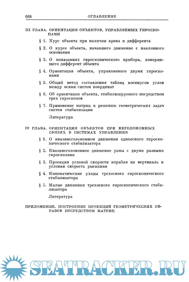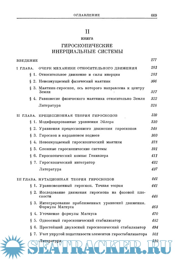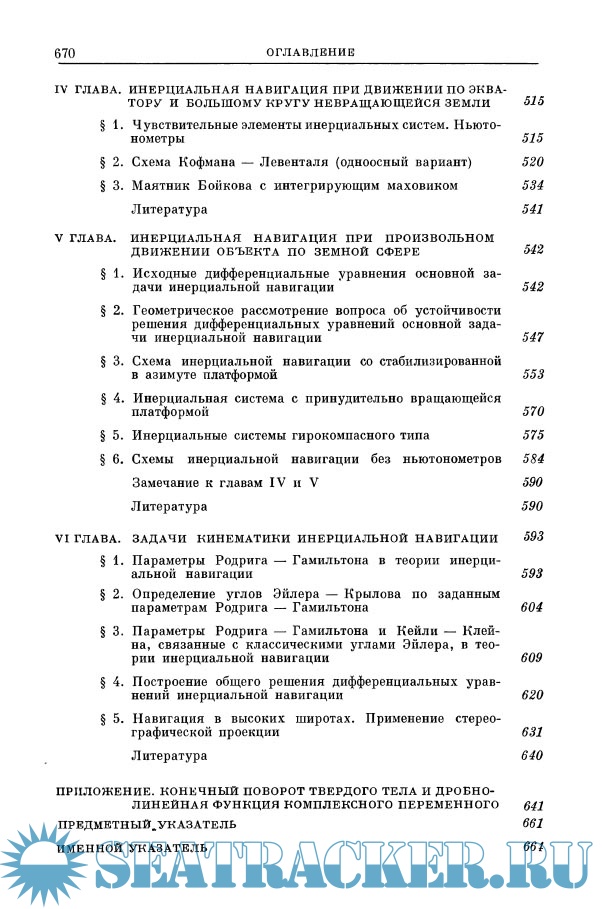 Описание: В монографии излагаются теоретические основы инерциальной навигации - определения ориентации и местоположения подвижных объектов без какой-либо информации извне, исходя исключительно из показаний чувствительных элементов механической природы, находящихся на самом объекте. Сюда относятся свободные гироскопы, гиромаятники, гиростабилизаторы, гирокомпасы, гироскопические и иные измерители кажущихся ускорений (ньютонометры). Описание теории поведения этих устройств в условиях относительного движения, главным образом применительно к задачам инерциальной навигации, составляет одно из центральных мест монографии. Использование гироскопической стабилизации на борту подвижных объектов в условиях их пространственного углового движения приводит к необходимости рассмотрения сложных геометрических и кинематических задач. В монографии приведены общие методы и примеры решения таких задач различными приемами, в том числе посредством матриц, параметров Родрига - Гамильтона и Кейли - Клейна и алгебры кватернионов. К собственно инерциальной навигации относится рассмотрение теории поведения конкретных схем, сочетающих в себе гироскопы, ньютонометры и счетно-решающих устройств, а также исследование дифференциальных уравнений, решение которых в конечном счете определяет местоположение объекта и его курс на земной сфере (система пространственной инерциальной навигации неустойчива).