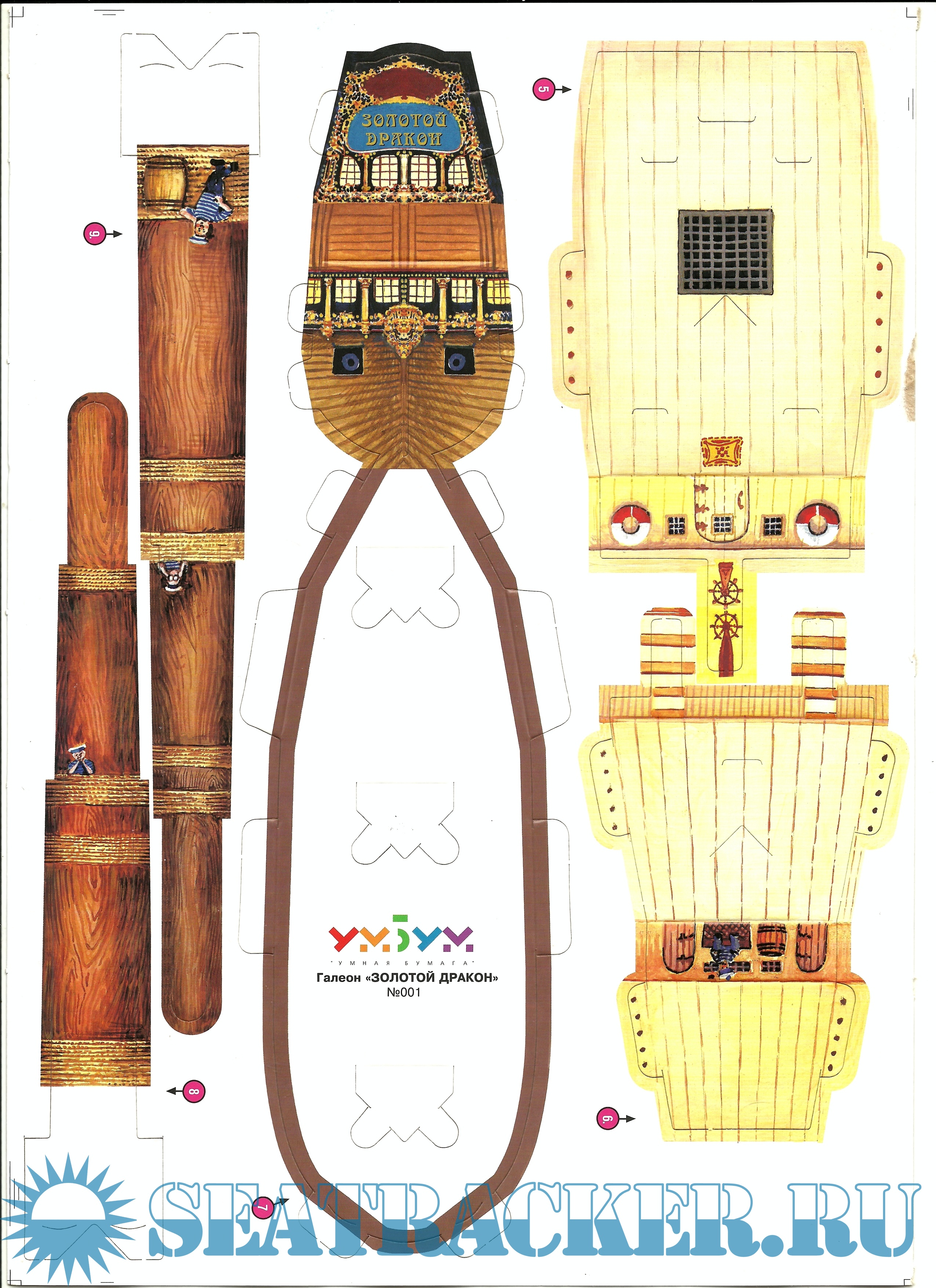 7 листов цветных выкроек и инструкций для изготовления бумажной модели галеона "Золотой дракон"