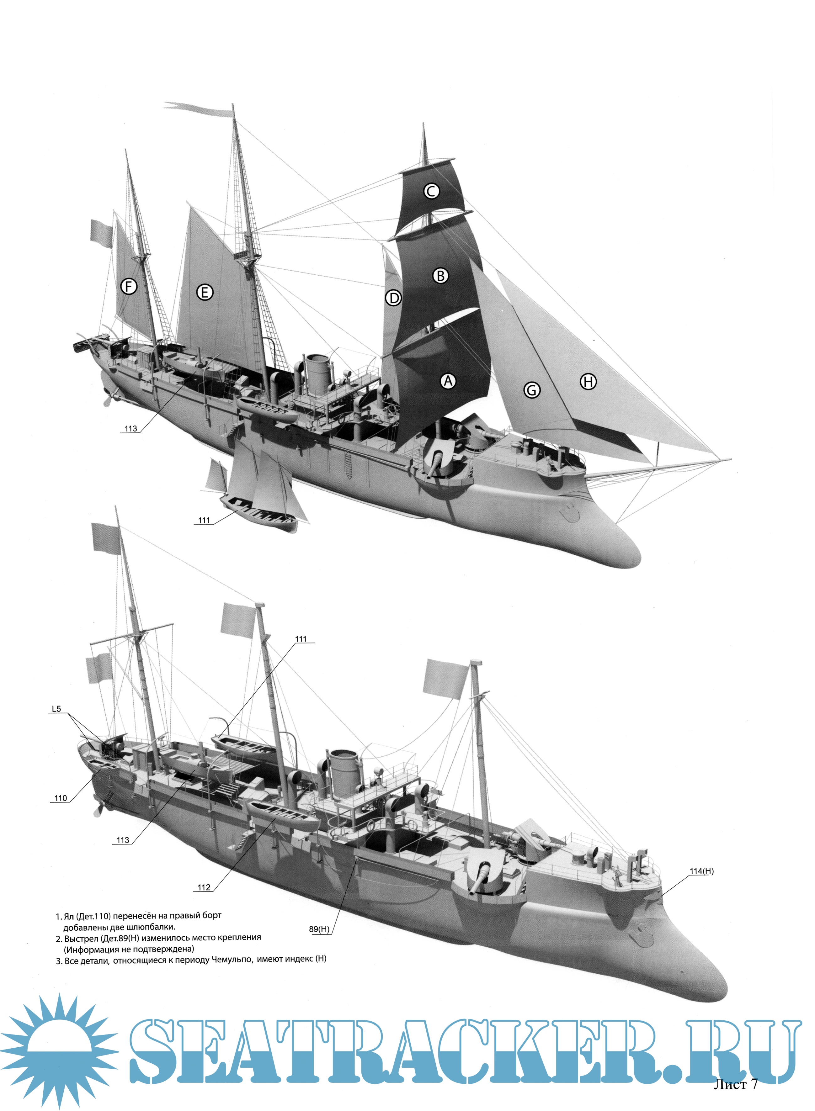 17 листов цветных выкроек и инструкций для изготовления бумажной модели канонерской лодки КОРЕЕЦ в масштабе 1:200