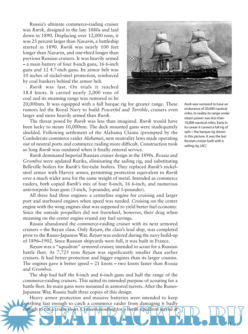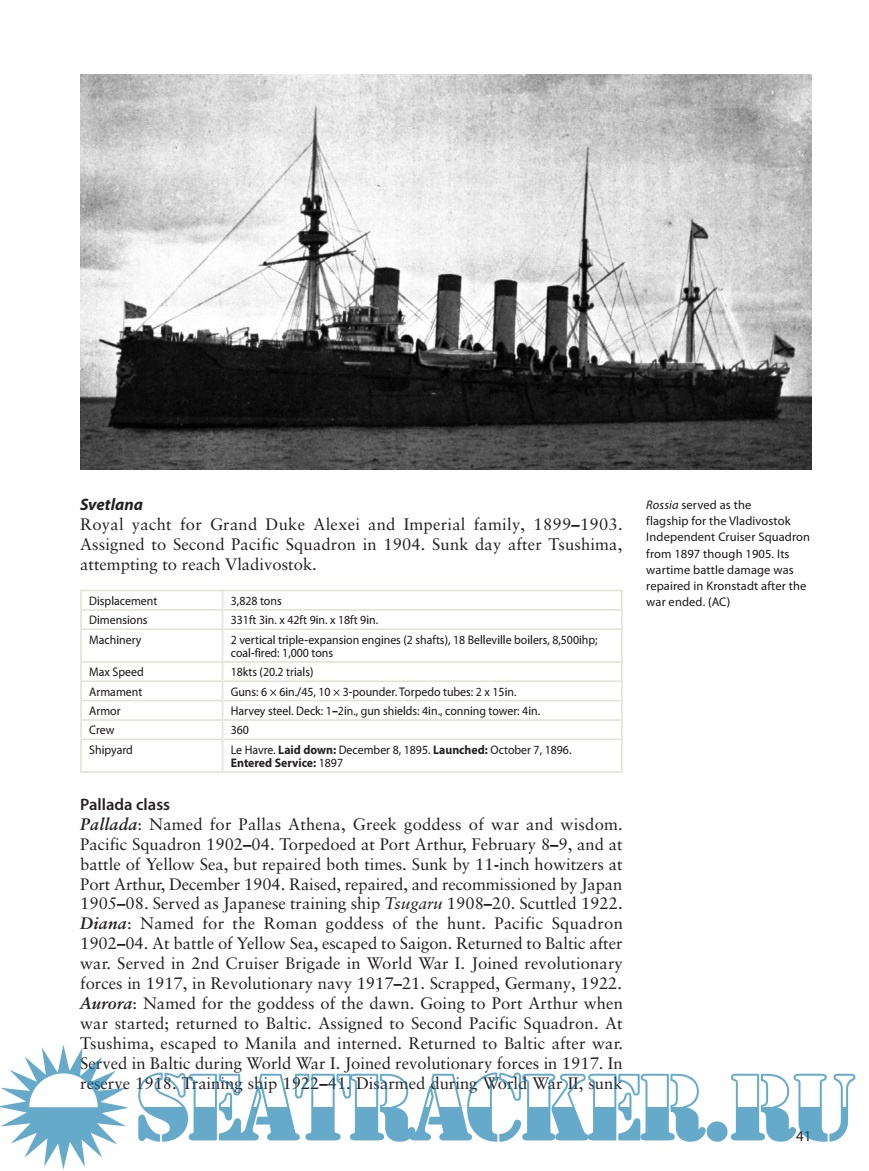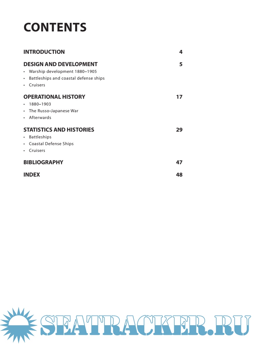It discusses in detail their design and development between the years of 1885 and 1905, concentrating particularly on battleships and cruisers. The book explores, in depth, the mutually influential relationship between Russian and foreign warship design, as Russia progressed from a reliance on foreign designs and shipyards towards an ability to produce its own influential ships, such as the Novik. The title also outlines the gripping operational history of the Russian warships which participated in the Russo-Japanese war, tracing their activity before and during the combat, as well as the post-war fate of those ships which were bombarded, scuttled, captured, or salvaged.