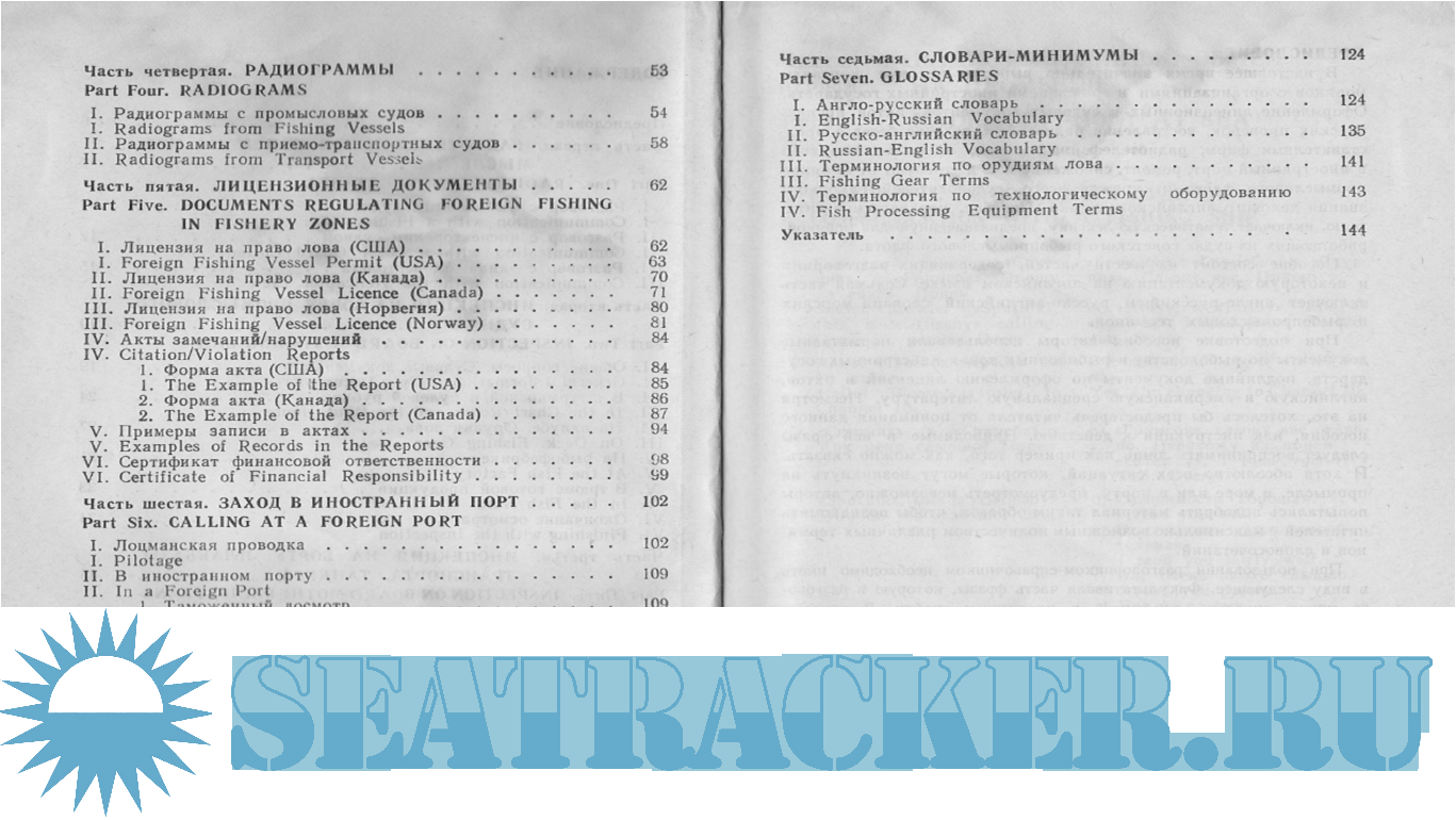 Описание: Пособие состоит из 6 частей, содержащих разговорник и некоторую документацию на английском языке. Седьмая часть включает англо-русский и русско-английский словари морских и рыбопромысловых терминов.