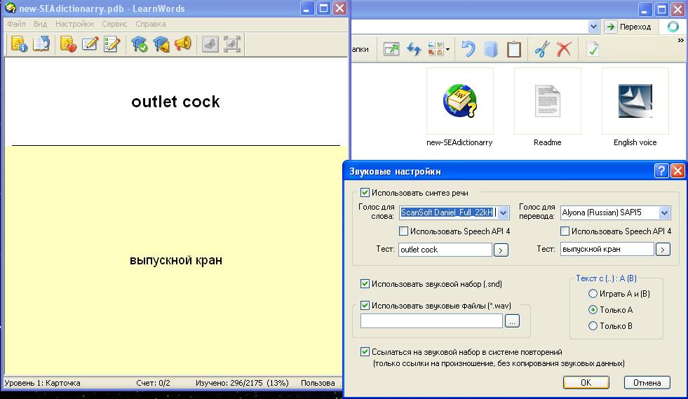 Learn Words.6.0 Год выпуска: 2011 Жанр: Education Описание: Отличный тренажёр для заучивания слов Доп. информация: 1) Установить (после установки не запускать) 2) Запустить файл learnwords.reg и разрешить добавление данных в реестр 3) Скопировать всё из папки Cracked в папку с установленной программой, разрешить замену файлов 4)установить английский голосовой движёк (файл English voice.exe) в настройках звука выбрать для английских слов этот движёк 5)В меню Файл->Открыть словарь:выбираем словарь new-SEAdictionarry (словарь для механиков,делал для себя,так что не судите строго, кому надо можете дописывать словарные статьи) В папке "LearnWords---Хранилище словарей" несколько словарей, загруженных с сайта програмы