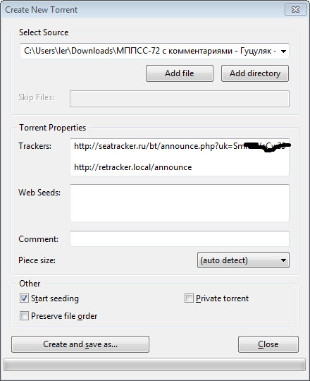 Но недавно обнаружил еще одну проблему. Она относится только к тем, кто раздает свои раздачи. Проблема в неправильном создании торрент файла. Дело в том, что при создании торрент файла надо указывать адрес нашего трекера и свой пасскей