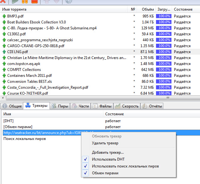 Отключить DHT и обмен пирами можно локально для нескольких торрентов или глобально через настройки uTorent. Для того чтобы отключить DHT для одного торрента заходим во вкладку трекеры и отключаем там DHT (снимаем три галочки), кроме seatracker