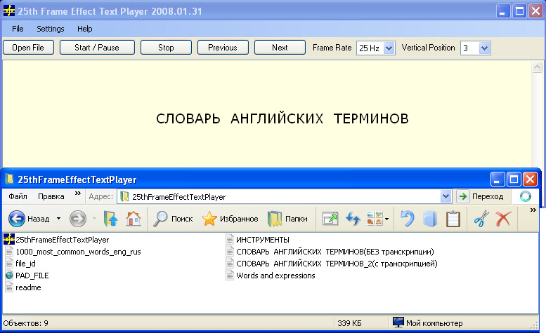 This program help you remember great volume of text information using 25th frame effect. Use possibilities of your subconsciousness. First of all open Unicode text file (for example open "1000_most_common_words_eng_rus.txt", it is simple english-russian dictionary of 1000 most common words). Then push Start/Pause button. Other functions you can try and see using all other controls. Text files for this program can be created and edited with any text editor program (for example Notepad). This files must be saved as Unicode text files. Microsoft NET Framework 2.0 must be installed.