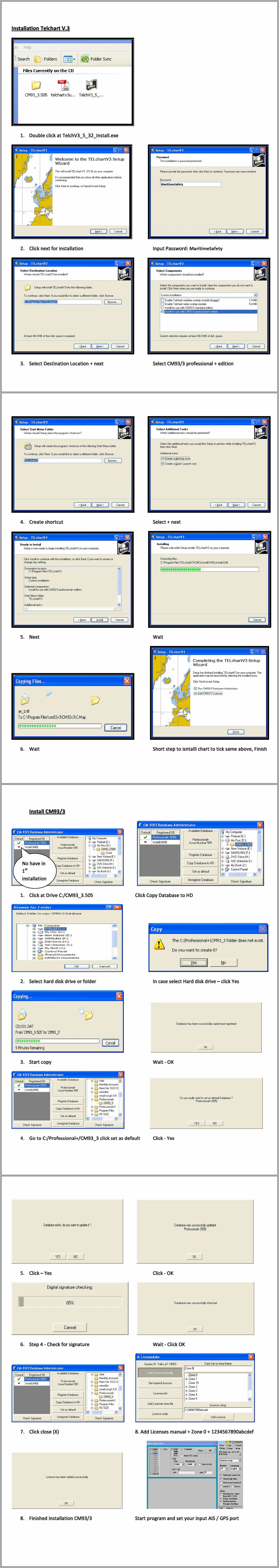 Telchart v3.5.32 installation: 1. Run "Telchart v3.5.32 setup.exe" and use the Password: MaritimeSafety 2. During installation choose the option "Install to use with CM93/3 professional+ edition" 3. Let the installation finish and install the charts. --------------------------------------------------------------------------------------------- Telchart v3.5.32 charts installation: 1. mount or extract "CM93 v3 (S57) WF766 (June 2016).iso" and copy (all files) to any folder on your PC where you like (for example C:\CM93ed3-WF766) 2. Run C:\Program Files (x86)\cm93v3\System\GDBAdmin.exe, show the path to CM93ed3 chart Database location (for example C:\CM93ed3-WF766), Register Database and Set it default. 3. Run C:\Program Files (x86)\cm93v3\System\LicenseAdm.exe. 4. Choose Zone 0 using “1234567890abcdef” as the key. 5. If you get a message that your license is expired or that will expire soon, try to change this key randomly, between the codes bellow, until you get it. 0123456789abcdfe 0123456789abcdfe 1234567890abcdfe 0123456789abcdef 123abc456def7890 2222222222222222 ffffffffffffffff 9999999999999999 You can use whatever key combination you want, as long as it is made of 0-9 and/or a-f. Enjoy!