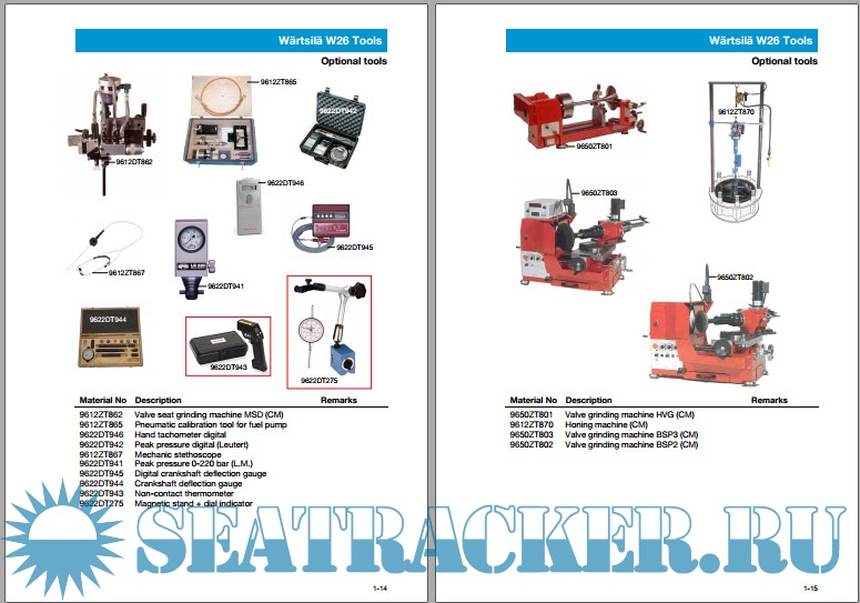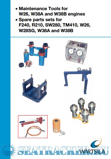 Year: 2012 Language: english Author: Wärtsilä Genre: Technical book Publisher: Wärtsilä Format: PDF Quality: eBook Description: The aim of this booklet is to give an overview of the available maintenance tools and spare part sets. At the moment of printing this booklet the information has already been changed. This due to our continuous effort to improve and complete the sets. Please consult the local WARTSILA® representative for the latest update. All released information and definitions have been made available at the WARTSILA® Intranet. Maintenance Tools W26, W38A and W38B: All present available tools and tool sets have been grouped per engine type. The maintenance set sheet specifies all tools, consequently some tools are mentioned again in other sets. In case of ordering please check for doublings Some of the maintenance tools as shown in this booklet might have been supplied with the engine. The tools presented are the latest execution and might work at different pressures. Please consult your engine manual for the correct information. Modifications and/or improvements have already been communicated via our After Sales Information letters and instructions. In the Index you will find which tools are used in which set. Spare part sets R210, F240, W26, W280, W28SG, W38 and TM410: The spare part sets have been defined based upon vast experience and best engineering practice. Within the spare part set sheet we defined engine type and assembly for which the set has been defined. Modifications and/or improvements will be communicated via our After Sales spare part notes.