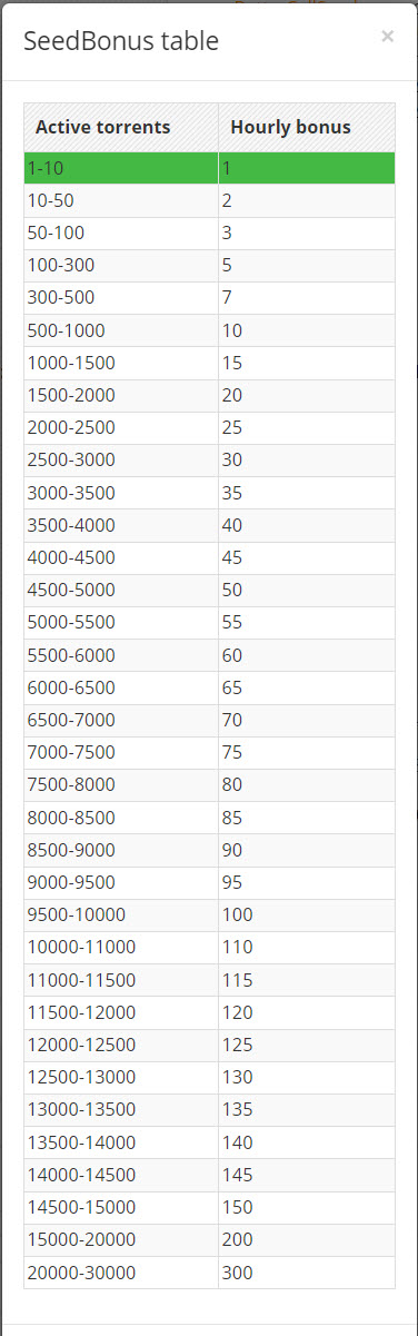 Пример: Пользователь, который раздает 500 торрентов круглые сутки (см. Таблица начисления сид бонусов) будет получать по 10 сид-бонусов каждый час. Это 240 бонусов в сутки или 7500 бонусов в месяц. Затем в любой момент можно обменять эти бонусы на прибавку к аплоаду тем самым вы повысите свой рейтинг и как следствие количество доступных скачиваний в стуки