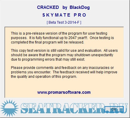 Year: 2012 Version: 3F Developer: Promar software Platform: Vista & Wndows7/8/10 32-bit and 64-bit Compatibility with Windows7: yes System Requirements: The Microsoft .NET Framework 3.5 must be installed on your system before you can run the latest version of Skymate Pro 2012 Localization: english Crack: Yeeah! Description: Skymate Pro 2012: The Navigator's Almanac is a computerized Nautical Almanac. Using an internal almanac for the years 1900-2100, Skymate Pro 2012 will provide Mariners the accurate information needed for celestial navigation at sea. To maximize the full potential of Skymate Pro 2012, the user should have a working knowledge and proficiency in the terminology and skills of celestial navigation. Additional info: Если у вас не установлена соответствующая версия .NET Framework, программа предложит ее скачать и установить. После установки программы и замены исполняемого файла, данная бэтка будет работать до конца 2047 года. Региональные параметры вышей Windows должны быть либо английскими, либо в русских региональных параметрах должен быть изменен разделитель целой и дробной части чисел с запятой на точку, также как это принято по умолчанию в английских региональных параметрах! Иначе программа может работать неправильно!