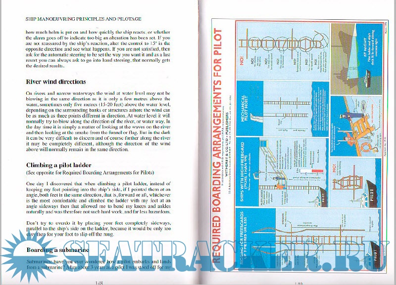 Agreeing the ship's program. etc. Giving engine outers ami Ih'Iiii orders, cate with twin serewotl ships with single rudders, giving directions to tugs, checking the gym compass, steering characteristics of different ships, checking automatic steering settings, noting the difference in wind directions when navigating rivers, climbing a pilot ladder, and how to boaid a submarine.