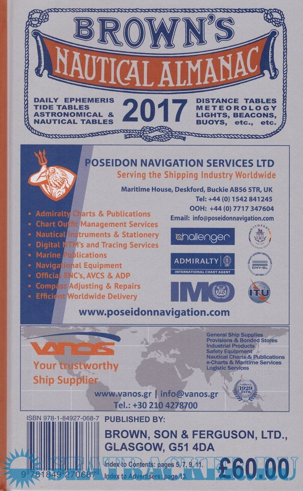 The Almanac is arranged in parts that are numbered for ready reference from I to VII as follows:- I, Astronomical data in daily use by navigators, explanations of its use. II, Nautical Tables and Methods. III, Tide Tables for Home and Foreign Waters. Predictions have been compiled by the most reliable authorities as acknowledged. The Tidal Constants for British Isles and Foreign Ports. IV, Coastal Courses and Distances around the British Isles. Courses are given Correct Magnetic (2017) and in True (3-figure) notation. Distances are given to the nearest 0.25 of a mile. The Table of Courses and Distances around the British Isles, North Sea, English Channel and the Baltic Ports. V, Distance Tables giving a world-wide coverage of total distances from the principal ports of Britain, U.S.A. and Canada, to all important ports of the world.