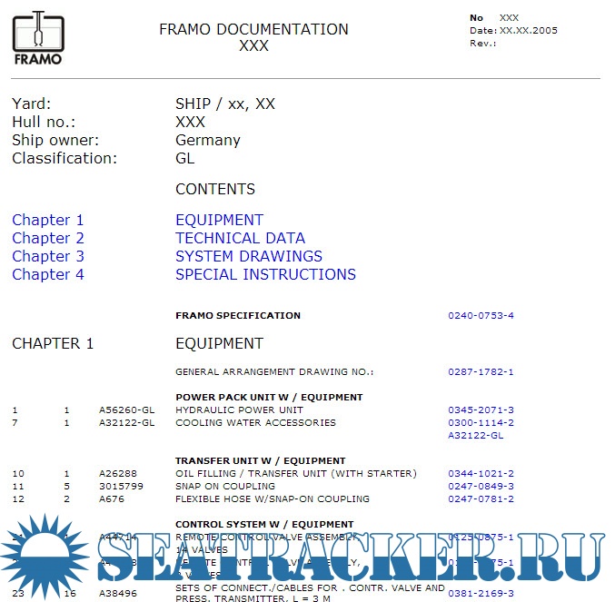Year: 2005 Language: english Author: FRANK MOHN AS Genre: Documentation Publisher: FRANK MOHN AS Format: PDF Quality: eBook Number of pages: 150 Description: FRAMO DOCUMENTATION XXX No XXX Date: XX.XX.2005 Rev.: Yard: SHIP / xx, XX Hull no.: XXX Ship owner: Germany Classification: GL CONTENTS Chapter 1 EQUIPMENT Chapter 2 TECHNICAL DATA Chapter 3 SYSTEM DRAWINGS Chapter 4 SPECIAL INSTRUCTIONS