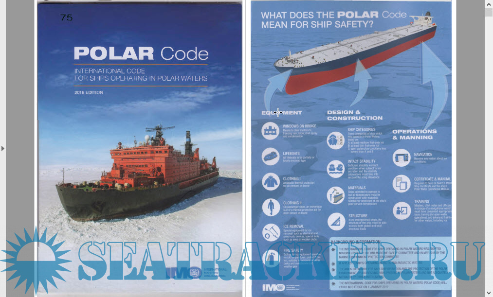 Year: 2016 Language: english Author: International Maritime Organization Genre: Practical guide Publisher: International Maritime Organization ISBN: 978-92-801-1628-1 Format: PDF Quality: Scanned pages + text layer Number of pages: 83 Description: The Polar Code has been developed to supplement existing IMO instruments in order to provide a more comprehensive set of provisions to address the increased interests and traffic in the polar regions, and the unique operational environmental and search and rescue concerns peculiar to these areas, taking into account that the consequences of any major safety or pollution incident in polar waters are likely to cause widespread harm to these pristine environments.