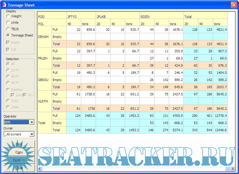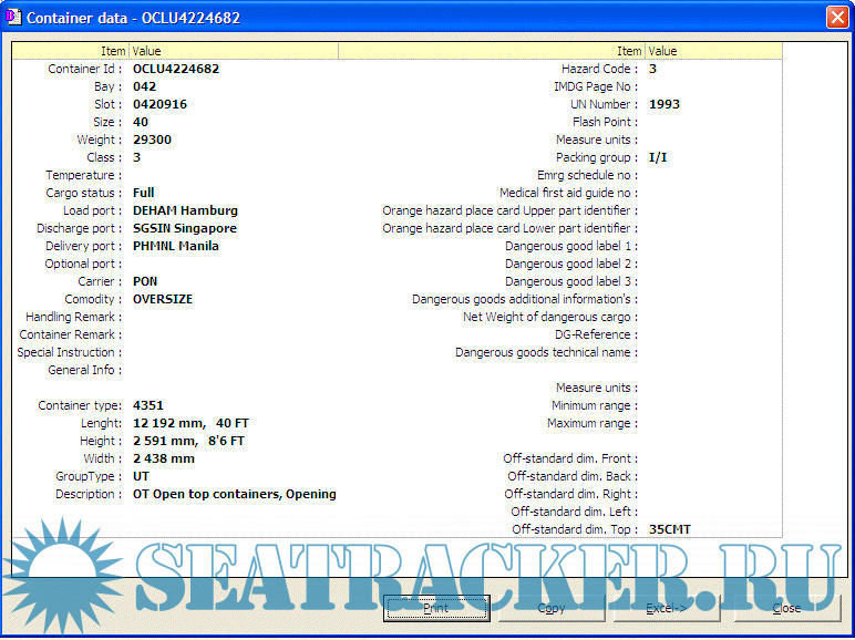 BV can handle standard BAPLIE files with and without line ends (see Remove line feed for explanation). BV can be used on any container vessel, regardless of number of bays, rows, and tiers. Number of containers, discharging ports are limited only by computer memory and BAPLIE file limitation. One floppy disk of 1.44 Mb may contain about 10000 containers, number will vary depending of size of information accompanying reefer and class containers. BV can filter, sort, print reports, find container and store last 4 working conditions for fast retrieval. Decoded files can be exported as DBF (dBase IV), CSV (comma separated value) and TXT (text files TAB delimited). BAPLIE file can be converted for use with to Easeacon@ stability program. Baplie Viewer can export container data to Excel sheet using preset template. What is BAPLIE? BAPLIE is set of instructions stored in text file, used to transmit information about all occupied places on board of a vessel to interested parties like ship-owner and the terminal operator in next port of call. Although the message is also suitable to transmit information about empty places this feature is not used. In generally, only complete messages “BAPLIE” have to be transmitted, whereas only occupied stowage locations, either by equipment or special cargo (break bulk), should be mentioned. The message can be transmitted to the vessel (i.e. via modem or by floppy disk) eliminating the use of the paper “master” plan. Who controls BAPLIE instructions? BAPLIE is designed by the SMDG (User group for Shipping Lines and Container terminals). Full name of the BAPLIE file is “UN/EDIFACT UNITED NATION STANDARD MESSAGE (UNSM) BAYPLAN/STOWAGEPLAN OCCUPIED AND EMPTY LOCATION MESSAGE” (BAPLIE).