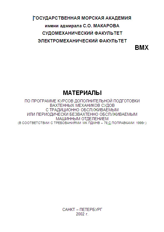 Программа курсов по подготовке вахтенных механиковГод выпуска: 2002 Автор: Несколько авторов Издательство: ГМУ имени адмирала С.О. МАКАРОВА Формат: DOC Качество: OCR без ошибок Количество страниц: 128 Описание: Материалы по программе курсов дополнительной подготовки вахтенных механиков судов с традиционно обслуживаемым или периодически безвахтенно обслуживаемым машинным отделением (В соответствии с требованиями МК ПДМНВ – 78 с поправками 1995 г.) / Издание второе. / Стр. 132, илл. 125, табл. 5. Материалы предоставлены РАЗДЕЛ I. СУДОВЫЕ МЕХАНИЧЕСКИЕ УСТАНОВКИ