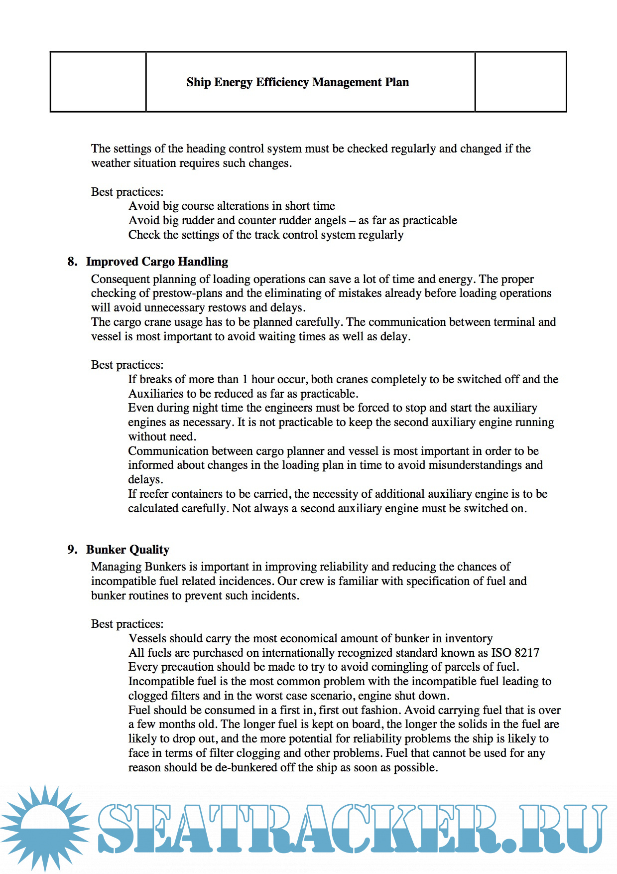 Year: 2013 Language: english Author: German ship owner Genre: Reference book Format: PDF Quality: eBook Pages count: 21 Description: The purpose of the Shipboard Energy Efficiency Management Plan (SEEMP) is to establish procedures for Company to improve the energy efficiency of the ship’s operation. Company honors its commitment to protect people and the environment by tracking and analysing energy consumption on vessels, using lessons learned and best practices, to improve energy efficiency while reducing emissions. It is Company Policy that vessels are always operated and marine operations conducted as efficiently as possible, consistent with safe and reliable operations. Increased energy efficiency remains the cheapest and most abundant form of new energy available today. SEEMP lays the foundation to put processes in place to optimize operational processes and improve profitability through the efficient use of people and assets. It is a resource guide for all personnel to increase energy efficiency in vessel systems and operational processes. Additional info: Company logo, adress, vessel's name, call sign are deleted (just for confidential purposes)