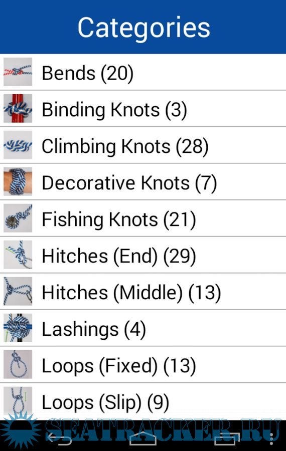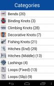 18 CATEGORIES include: Bends, Binding Knots, Climbing Knots, Decorative Knots, Fishing Knots, Hitches (End), Hitches (Middle), Lashings, Loops (Fixed), Loops (Slip), Navy SEAL Knots, Rope Care, Sailing Knots, Scout Knots, Shortenings, Splices, Stopper Knots, Whippings.