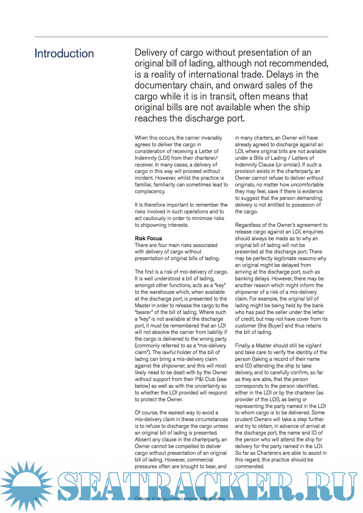 Description: Delivery of cargo without presentation of an original bill of lading, although not recommended, is a reality of international trade. Delays in the documentary chain, and onward sales of the cargo while it is in transit, often means that original bills are not available when the ship reaches the discharge port.
