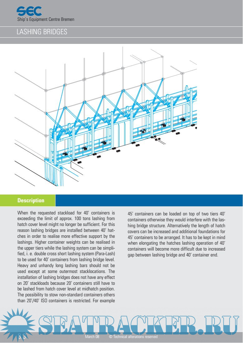 Year: 2008 Language: english Author: SEC Publisher: SEC Format: PDF Quality: eBook Pages count: 145 Description: Ship's Equipment Centre Bremen (SEC) is considered to be today's worldwide leading manufacturer of container lashing equipment. The basis of this leading position is the perfect combina- tion of in house design and engineering facilities. This combined with unique know how of manufacturing and services has made Ship's Equipment Centre Bremen as a first class partner for yards and owners. An enthusiastic team of high skilled experts is operating out of the main office located in Bremen, Germany. A city which provides an infrastructure where the cargo secu- ring technology has quite a history. As essential support towards an all around service is provided by the international network of agencies and logistics partners. Ship's Equipment Centre Bremen products are being distributed through world wide stocks kept at the main centres of international shipping activities. This network is essential to make sure that only exclusive Ship's Equipment Centre products are being supplied. Whether supplied out of New York, Long Beach, Singapore, Shanghai or Europe, each fitting is an original Ship's Equipment Centre item.