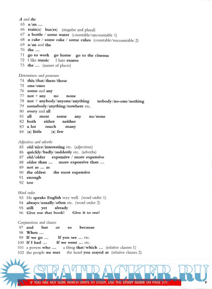 Present Past Present Perfect Passive Verb forms Future Modals There and it Auxiliary verbs Ouestions Reported speech ing and to Go, get do, make and have Pronouns and passesives A and the Determiners and pronouns Adjectives and adverbs Word order Conjunctions and clauces Prepositions Phrasal verbs