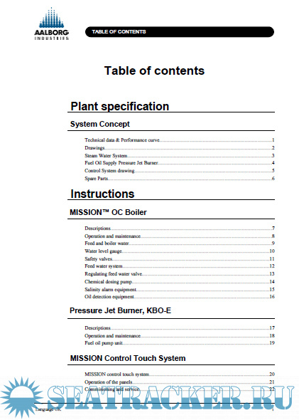 System Concept Technical data & Performance curve..............................................................................1 Drawings....................................................................................................................2 Steam Water System....................................................................................................3 Fuel Oil Supply Pressure Jet Burner...............................................................................4 Control System drawing...............................................................................................5 Spare Parts..................................................................................................................6 Instructions MISSION™ OC Boiler Descriptions................................................................................................................7 Operation and maintenance...........................................................................................8 Feed and boiler water...................................................................................................9 Water level gauge......................................................................................................10 Safety valves.............................................................................................................11 Feed water system......................................................................................................12 Regulating feed water valve........................................................................................13 Chemical dosing pump...............................................................................................14 Salinity alarm equipment............................................................................................15 Oil detection equipment..............................................................................................16 Pressure Jet Burner, KBO-E Descriptions..............................................................................................................17 Operation and maintenance.........................................................................................18 Fuel oil pump unit......................................................................................................19 MISSION Control Touch System MISSION control touch system...................................................................................20 Operation of the panels...............................................................................................21 Commisioning and service..........................................................................................22 TABLE OF CONTENTS Burner sequence diagram............................................................................................23 Flame safeguard.........................................................................................................24 Menu structure for panels............................................................................................25