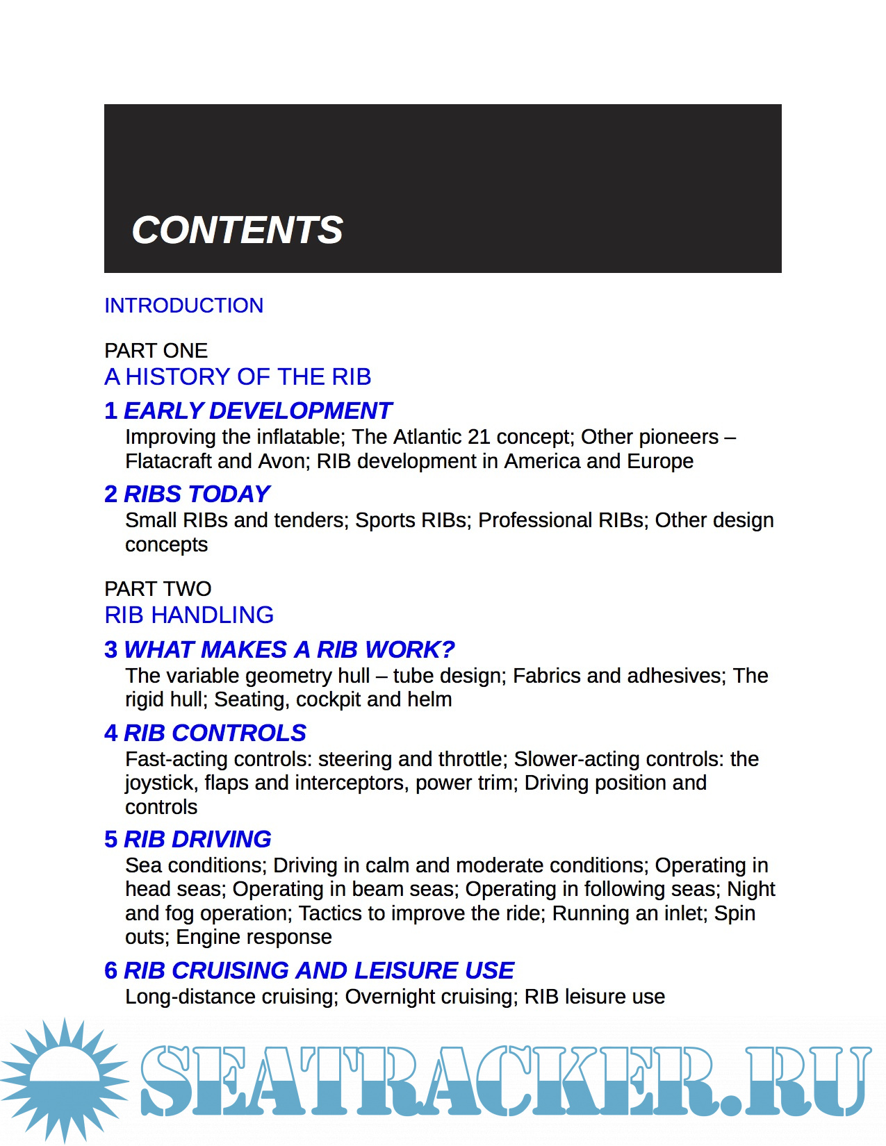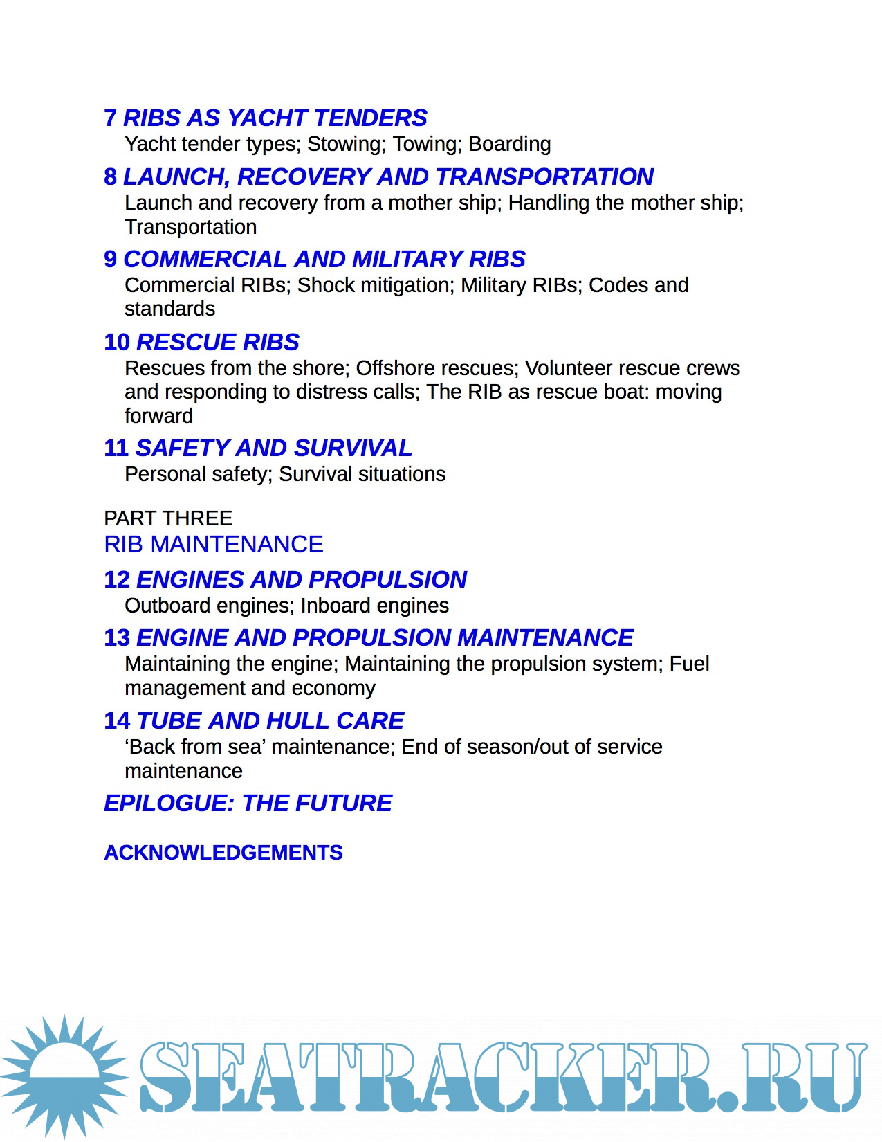 Year: 2013 Language: english Author: Dag Pike Genre: Manual Publisher: Adlard Coles Nautical ISBN: 9781408180129 Format: PDF Quality: eBook Pages count: 411 Book price: £35.00 Description: First built in the 1960s for rescue work, the Rigid Inflatable Boat has revolutionised the marine market. The Complete RIB Manual, published to coincide with the 50th anniversary of the first RIB, is the ultimate reference catering all aspects of a RIB's design, handling and maintenance, aimed at all owners and users, both commercial and leisure. The emphasis of the book is entirely practical, and covers: 1. A History of the RIB • Early development • Modern design: leisure, commercial and military 2. RIB Handling • Impact of hull design, tube types, internal layout and engines • Driving techniques: throttle control and driving position • Advanced techniques for economy, sport and rough seas • Cruising: planning, weather, anchoring and communications • RIBs as tenders - stowing and towing • Launching and transportation • Safety and survival 3. Maintenance • Outboards, diesels, water jets, stern drives, fuel tanks and electrics • Tube care: cleaning, repair, replacement • Hull maintenance • Winter storage, checking for leaks, servicing The Complete RIB Manual is a comprehensive worldwide reference for all RIB owners and users, covering all the information necessary to handle and maintain a RIB of any size.