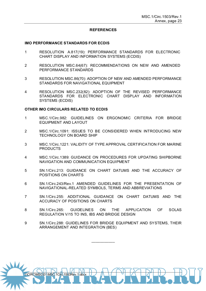 Year: 2017 Language: english Author: IMO Genre: Guide Publisher: IMO Edition: 16 June Format: PDF Quality: eBook Pages count: 25 Description: The Maritime Safety Committee, at its ninety-fifth session (3 to 12 June 2015), approved the ECDIS – Guidance for Good Practice, drawing together relevant guidance from seven previous ECDIS circulars into a single, consolidated document. The consolidated guidance termed "ECDIS – Guidance for Good Practice" is set out in the annex to this circular (referred to as "Guidance" hereafter). Ship operators, masters and deck officers on ECDIS-fitted ships are encouraged to use this guidance to improve their understanding and facilitate safe and effective use of ECDIS. Members of the Organization and all Contracting Governments to the SOLAS Convention are invited to bring this circular to the attention of all entities concerned. In particular, port States are invited to make the guidance available to their port State control inspectors, and flag States to shipowners, masters, recognized organizations, flag State control inspectors and surveyors. This circular revokes MSC.1/Circ.1391, MSC.1/Circ.1503 and Corrigenda 1, SN.1/Circ.207/Rev.1, SN.1/Circ.266/Rev.1, SN.1/Circ.276, SN.1/Circ.312, STCW.7/Circ.10 and STCW.7/Circ.18.